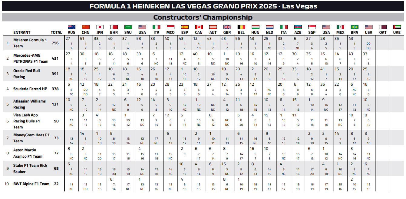 Τελική κατάταξη (οι McLaren αποκλείστηκαν):