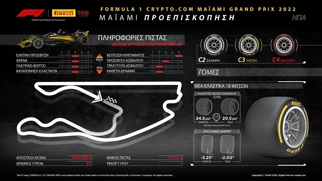- Για το πρώτο πολυαναμενόμενο αγώνα στους δρόμους του Μαϊάμι, η Pirelli επέλεξε τις τρεις μεσαίες γόμες της γκάμας της: Η C2 είναι η P Zero λευκή/σκληρή, η C3 είναι η P Zero κίτρινη/μέση και η C4 είναι η P Zero κόκκινη/μαλακή γόμα. Αυτός ο συνδυασμός είναι ο πιο συνηθισμένος κατά τη διάρκεια της χρονιάς, αλλά και αυτός που ταιριάζει στις περισσότερες περιπτώσεις.