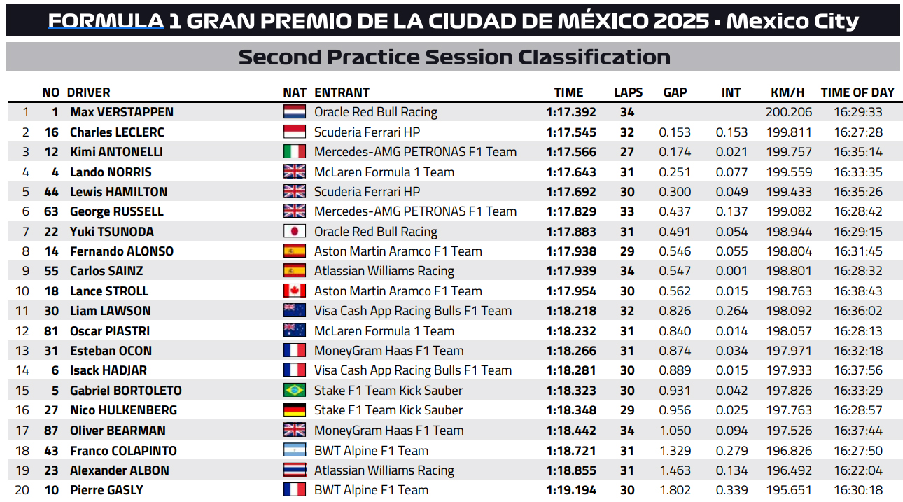 Η μαλακή γόμα, την οποία χρησιμοποίησαν όλοι οι οδηγοί για να σημειώσουν τους καλύτερους χρόνους τους, έκανε το 34% της δουλειάς, με την C2 (Σκληρή) να κάνει το υπόλοιπο. Όπως συμβαίνει πάντα στο Μεξικό ότι οι χρόνοι των γύρων θα μειωθούν σημαντικά τις επόμενες δύο ημέρες καθώς η πίστα θα «στρώνεται» (θα καθαρίζει και θα αποκτά πρόσφυση). Απομένει ακόμα αρκετός δρόμος για να πλησιάσουμε τον χρόνο της pole position του Κάρλος Σάινθ το 2024 με τη Ferrari, που ήταν 1’15’’946.