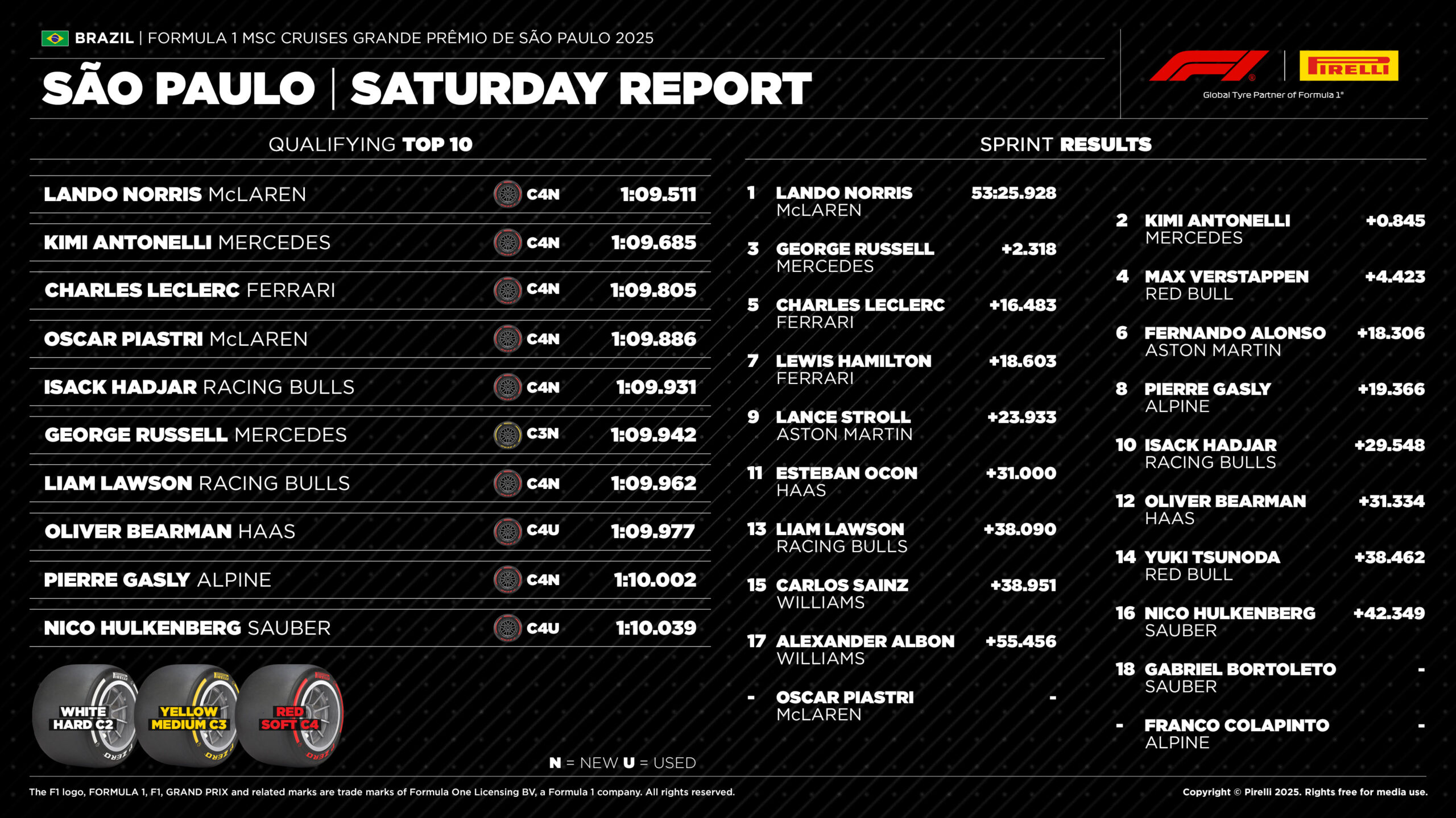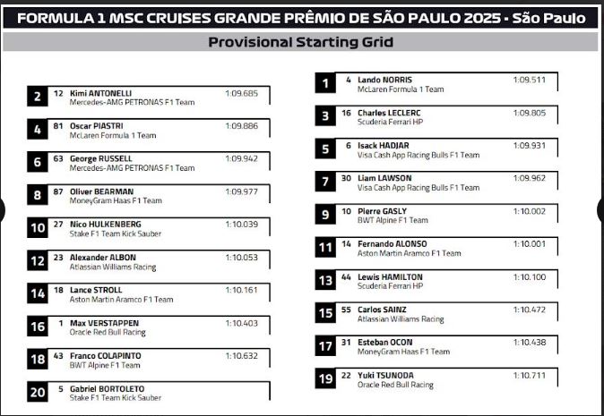 Δεύτερη μάχη αυτή μεταξύ των οδηγών της McLaren. Ο Πιάστρι εκκινεί από την 4η θέση και μετά την εγκατάλειψή του στο χθεσινό αγώνα Sprint βρίσκεται σε δύσκολη θέση καθώς ο Νόρις που κέρδισε στο Sprint έχει διαφορά 9 βαθμών. Χτες βράδυ μετά τη νίκη του στο Sprint, ο Νόρις κατέκτησε τη δεύτερη pole position του Σαββατοκύριακου στη Βραζιλία, αφού βρέθηκε επικεφαλής και στις τρεις περιόδους των κατατακτήριων δοκιμών αυτό το απόγευμα. Ο Πιάστρι θα πρέπει να περάσει τους Λεκλέρκ και Αντονέλι αν μπορεί, προτού διεκδικήσει κάτι παραπάνω από το Νόρις. Ο Αυστραλός οδηγός είναι ντεφορμέ και με κακή ψυχολογία οπότε μια θετική εμφάνιση είναι καθοριστική αν θέλει να μείνει με ρεαλιστικές ελπίδες στη μάχη του τίτλου. Πόσο μάλλον που αρκετές εικόνες δείχνουν πως ο Νόρις πάτησε σε νερά (επίτηδες;) τα οποία προκάλεσαν το γλίστρημα του Πιάστρι όπως και των Χούλκενμπεργκ, Κολαπίντο στο Sprint.
