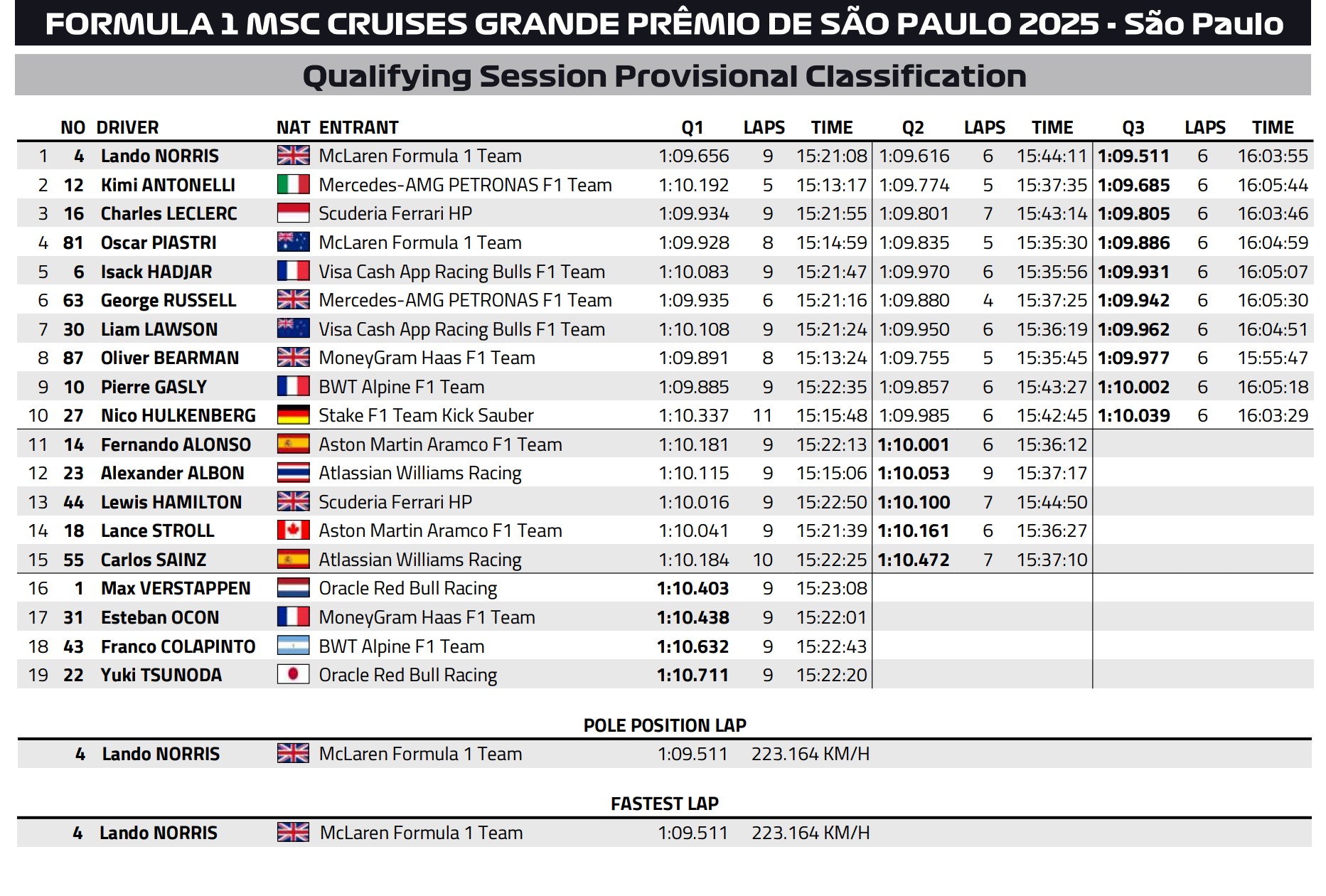 Στο Q2 είχαμε την 2η αρνητική έκπληξη από το Λιούις Χάμιλτον που αποκλείστηκε καθώς δεν μπόρεσε να σημειώσει ανταγωνιστικό χρόνο. Ο πρωταθλητής εκκινεί αύριο από την 13η θέση. Αντίθετα ο Σαρλ Λεκλέρκ με την άλλη Ferrari κατάφερε να κάνει τη διαφορά φέρνοντας τη Ferrari στην 3η θέση. Ο Μονεγάσκος βελτίωσε θεαματικά σε σχέση με τη χθεσινή του επίδοση στο Sprint Qualifying (8ος). Ο Νόρις έκανε λάθος στην πρώτη του προσπάθεια στο Q3. Βρέθηκε έτσι σε δύσκολη θέση αλλά την κρίσιμη στιγμή αντέδρασε σωστά και πέτυχε ένα γύρο ταχύτερο από τους υπόλοιπους οδηγούς. Έτσι ξαναπήρε την pole όπως και χτες. Στην ίδια θέση κατετάγη και ο Κίμι Αντονέλι με τη Mercedes ξανά μπροστά από το Ράσελ που περιορίστηκε στην 6η θέση. Ο έτερος οδηγός της McLaren, Όσκαρ Πιάστρι δεν κατάφερε κάτι περισσότερο από την 4η θέση εκκίνησης. Ήδη μετά την εγκατάλειψή του στον αγώνα Sprint είναι 9 βαθμούς πίσω από το Νόρις και αύριο θα έχει δύσκολη δουλειά προσπαθώντας να ελαχιστοποιήσει τις απώλειες.