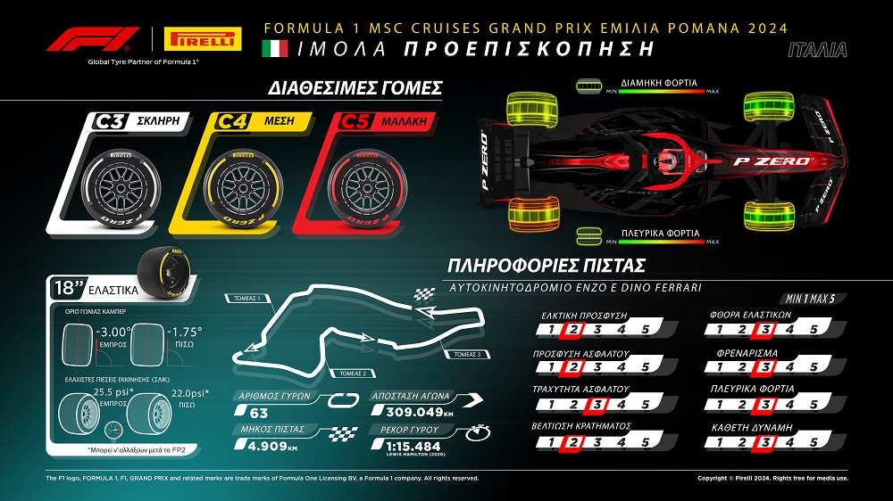 Η Ιταλία έχει φιλοξενήσει συνολικά 105 Grand Prix παγκοσμίου πρωταθλήματος, τα περισσότερα από οποιαδήποτε άλλη χώρα, με 30 εξ αυτών να λαμβάνουν χώρα στην πίστα «Autodromo Enzo e Dino Ferrari» στην Ίμολα. Ο αγώνας αυτού του Σαββατοκύριακου είναι μόλις η τέταρτη έκδοση του «Gran Premio dell’Emilia-Romagna e del Made in Italy», που ξεκίνησε το 2020 και έγιναν 3 αγώνες έως το 2022. Η περσινή διοργάνωση ακυρώθηκε λόγω πλημμυρών που έπληξαν μεγάλα τμήματα της περιοχής, προκαλώντας θανάτους και καταστροφές. Για τον έβδομο γύρο της σεζόν, η Pirelli επέλεξε τις τρεις πιο μαλακές γόμες της γκάμας της για στεγνό οδόστρωμα: C3 ως σκληρή, C4 ως μέση και C5 ως μαλακή. Είναι η πρώτη φορά που αυτή η τριάδα θα χρησιμοποιηθεί στην πίστα της Emilia. Ίδια επιλογή είχε γίνει και πέρυσι που ακυρώθηκε ο αγώνας. Το 2022, οι επιλεχθείσες γόμες ήταν C2, C3 και C4.