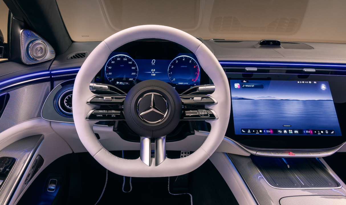 Στον βασικό εξοπλισμό, το MBUX Superscreen ενοποιεί την κεντρική οθόνη 14,4 ιντσών και την οθόνη του συνοδηγού 12,3 ιντσών κάτω από μία ενιαία γυάλινη επιφάνεια, δημιουργώντας ένα εντυπωσιακό, γλυπτικό σύνολο. Ο οδηγός επωφελείται από καθαρές και εστιασμένες πληροφορίες, ενώ ο μπροστινός επιβάτης απολαμβάνει μια εξατομικευμένη εμπειρία ψυχαγωγίας – όπως streaming, παιχνίδια ή εφαρμογές – ακόμη και κατά την κίνηση του οχήματος, σύμφωνα με τους κανονισμούς που ισχύουν σε κάθε χώρα. Μια λειτουργία προστασίας ιδιωτικότητας με κάμερα προσαρμόζει διακριτικά την οθόνη του συνοδηγού, ώστε να ελαχιστοποιείται η απόσπαση της προσοχής του οδηγού. Ο ψηφιακός πίνακας οργάνων 12,3 ιντσών, προαιρετικά διαθέσιμος και σε τρισδιάστατη απεικόνιση, μοιάζει να αιωρείται πίσω από το τιμόνι με εντυπωσιακή καθαρότητα. Επιμελημένα, υψηλής ανάλυσης στιλ φωτισμού και οπτικοποίησης από τους σχεδιαστές UI της Mercedes-Benz μετατρέπουν την MBUX Superscreen σε έναν ατμοσφαιρικό, καθηλωτικό ψηφιακό χώρο που αναβαθμίζει κάθε διαδρομή.