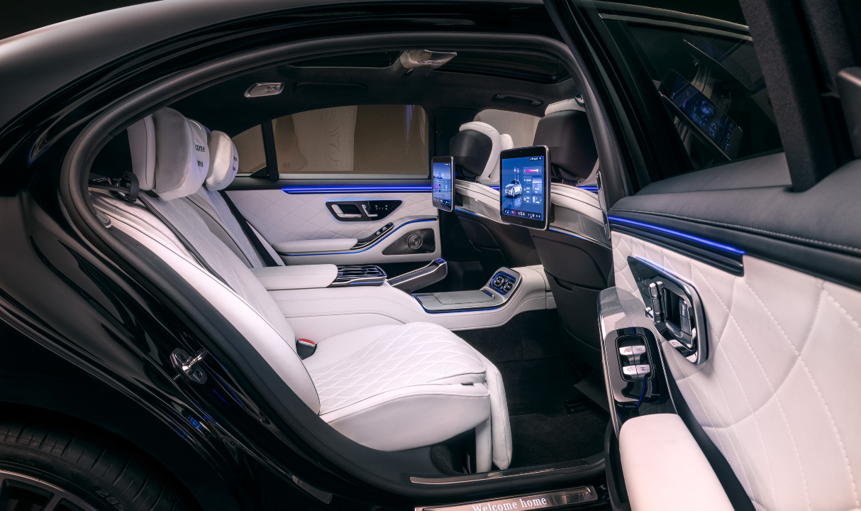 Το εσωτερικό της S-Class έχει σχεδιαστεί για να προσφέρει το αίσθημα “Welcome home.”. Οι πίσω επιβάτες απολαμβάνουν μια εμπειρία Business Class, ειδικά στην έκδοση με το μακρύ μεταξόνιο. Δύο οθόνες 13,1 ιντσών και δύο αποσπώμενα χειριστήρια MBUX επιτρέπουν τον πλήρη έλεγχο του οχήματος. Ενσωματωμένες HD κάμερες επιτρέπουν συμμετοχή σε κλήσεις Microsoft Teams ή Zoom εν κινήσει. Καινοτομίες όπως η θερμαινόμενη ζώνη ασφαλείας, το Digital Vent Control και το νέο ηλεκτρικό φίλτρο αέρα με energizing air control ενισχύουν την καθημερινή άνεση, την ευεξία και την ατμόσφαιρα στο εσωτερικό.