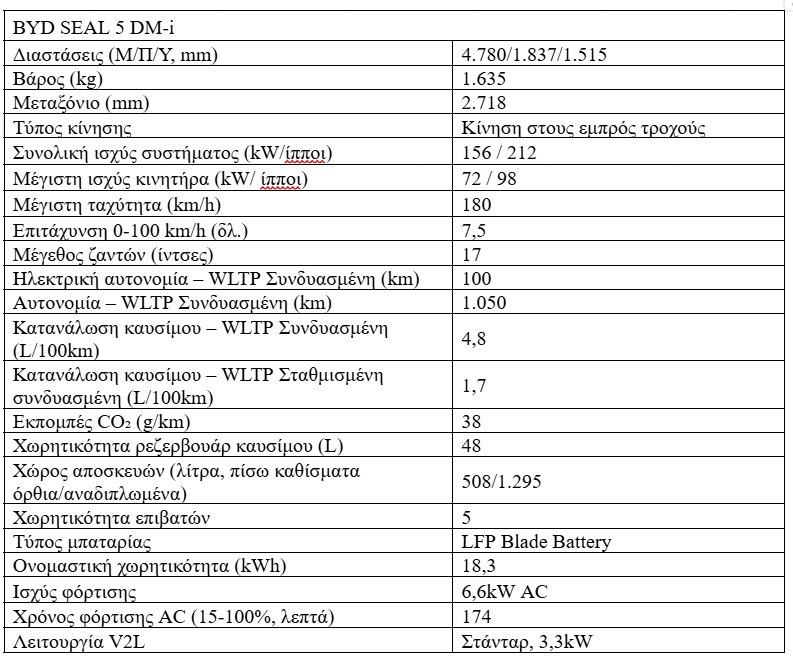 Το SEAL 5 DM-i διαθέτει ευρύχωρο θάλαμο επιβατών και προηγμένη τεχνολογία Super Hybrid DM plug-in. Πρόκειται για το πρώτο plug-in υβριδικό μοντέλο Super DM της BYD με sedan αμάξωμα που λανσάρεται στη χώρα μας. Διαθέτει δε αυτονομία που υπερβαίνει τα 1.000 km με ένα γεμάτο ρεζερβουάρ και μια πλήρη φόρτιση.