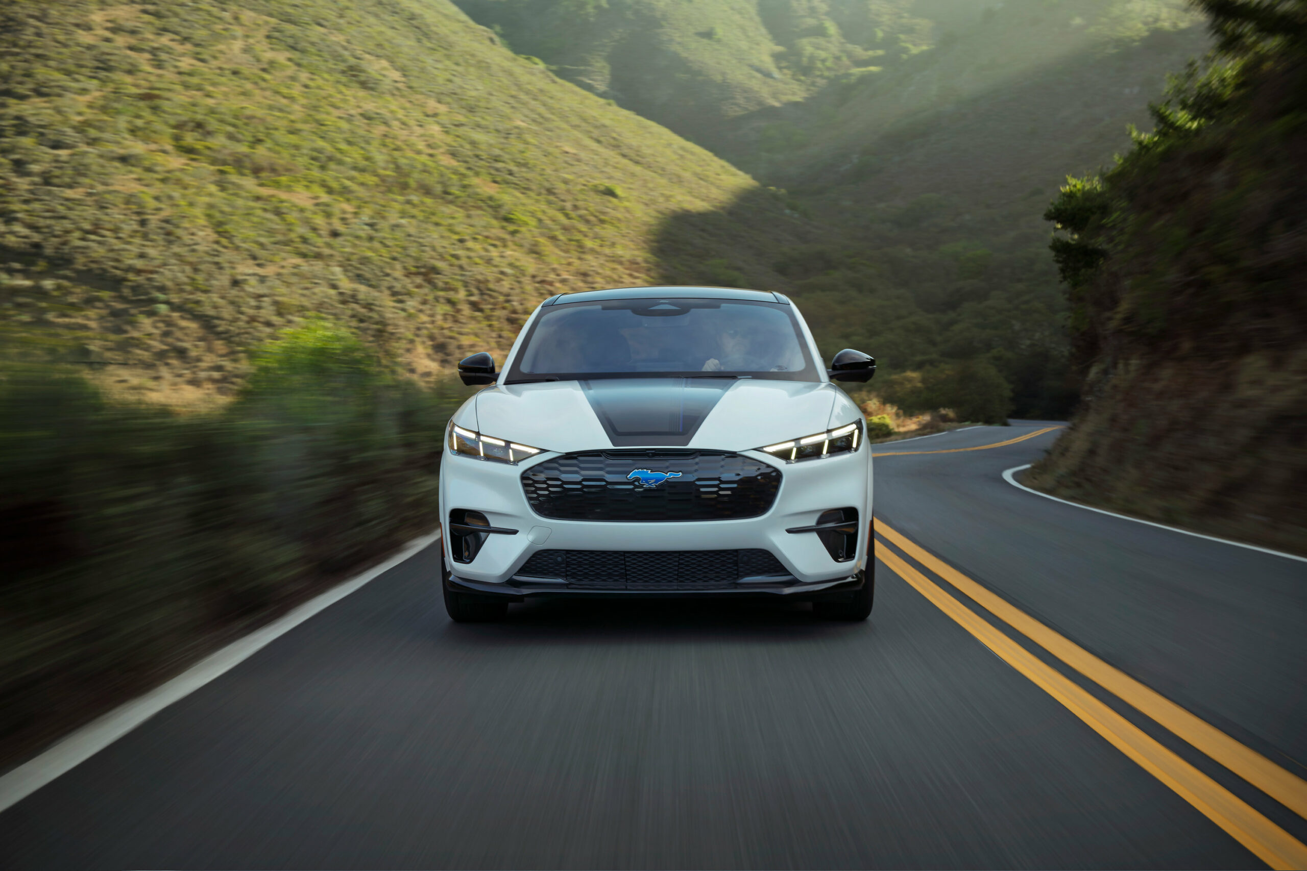 Η Mustang Mach-E διαθέτει πρόσθετα σχεδιαστικά στοιχεία, όπως είναι οι ζάντες 20 ιντσών, οι οποίες είναι βαμμένες σε γκρι χρώμα και διαθέτουν το λογότυπο GT – αυτές συνδυάζονται με γυαλιστερά μαύρα αεροδυναμικά καλύμματα. Επίσης, χαρακτηριστικό στοιχείο είναι και το φωτιζόμενο pony σε χρώμα Rave Blue, καθώς και ένα ειδικό γραφικό στο καπό, το οποίο αντλεί έμπνευση από την ακτογραμμή της Καλιφόρνια.