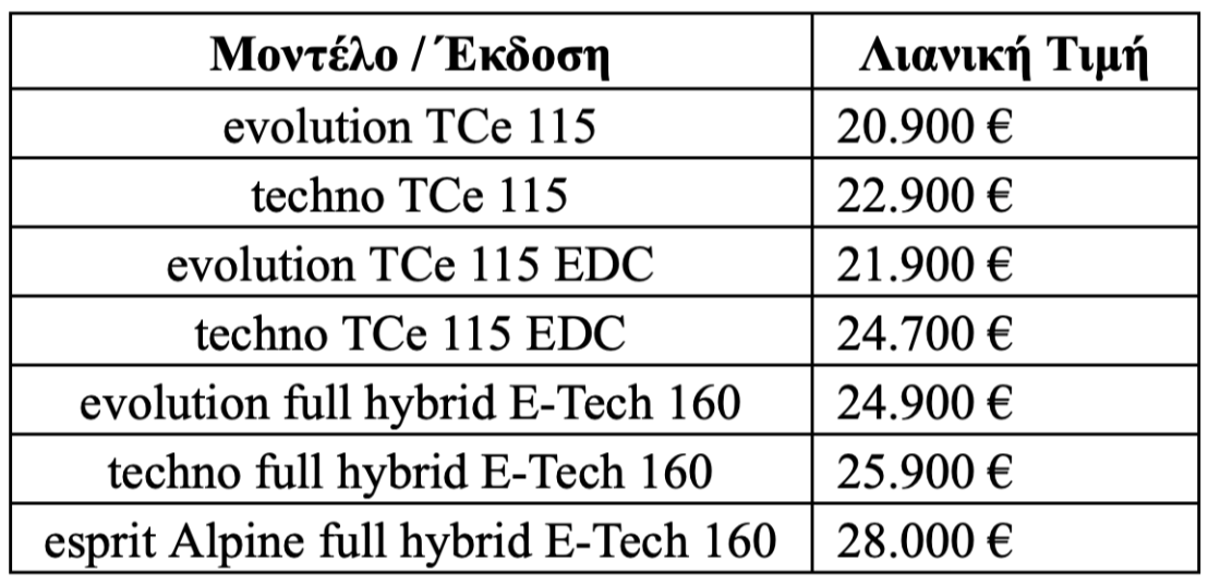 Είχαμε την ευκαιρία να οδηγήσουμε την υβριδική έκδοση 1.8lt/160PS. Ο full hybrid E-Tech κινητήρας των 160PS εξελίχθηκε από την Horse Powertrain (επιτάχυνση 0 – 100km/h σε 8,3sec) και είναι αποδοτικός. Οι εκπομπές CO2 δεν ξεπερνούν τα 89g/km ενώ η κατανάλωση που είδαμε είναι στα 4.5lt/100km.