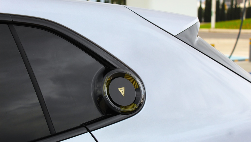 Στο πλάι, το S05 δείχνει την πιο δυναμική του πλευρά. Η γραμμή της οροφής κατεβαίνει ομαλά προς τα πίσω, ενώ τα φουσκωμένα φτερά δίνουν ένταση στο σύνολο. Οι ζάντες των 20″ δεικνύουν τον πληθωρικό του χαρακτήρα με διακριτικότητα, είναι μεγάλες αλλά ταιριαστές. Στην πίσω πόρτα στην πλευρά του οδηγού υπάρχει ένας δείκτης ο οποίος μας ενημερώνει για το ποσοστό φόρτισης του αυτοκινήτου, πρωτόγνωρο και πρωτοποριακό.