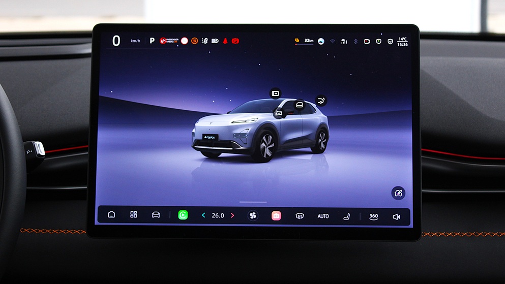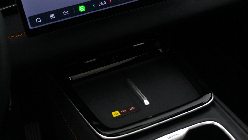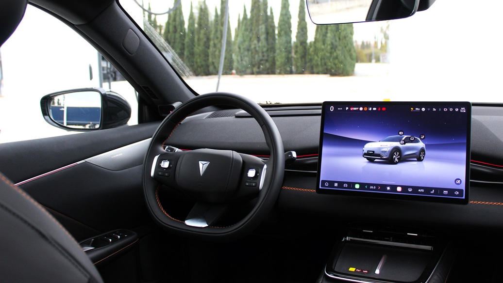 Μπαίνοντας στο εσωτερικό, το πρώτο που παρατηρείς είναι η ηρεμία. Το ταμπλό είναι καθαρό, με οριζόντια διάταξη και ποιοτικά υλικά. Κυριαρχεί η κεντρική οθόνη αφής των 15,4″, ευκρινής και γρήγορη, από όπου ελέγχονται σχεδόν τα πάντα. Τα μαύρα καθίσματα με τις πορτοκαλί ραφές δίνουν ζωντάνια χωρίς να κουράζουν, ενώ οι ίδιες ραφές συνεχίζονται στο ταμπλό και στο τιμόνι, δημιουργώντας συνοχή.