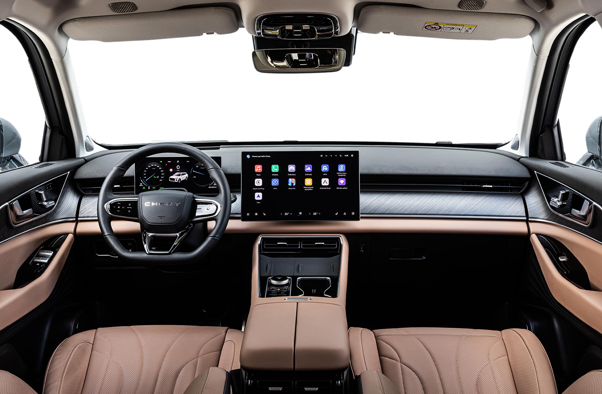 Το εσωτερικό του Tiggo 9 έχει σχεδιαστεί ως ένας χώρος ευεξίας και ηρεμίας, με υλικά κορυφαίας ποιότητας και έξυπνη διαρρύθμιση. Η καμπίνα είναι επενδυμένη με καφέ δέρμα σε κάθε σημείο επαφής, ενώ το ταμπλό διαθέτει πολυτελή υφή σουέτ και διακοσμητικά πάνελ με μοτίβο ξύλου.