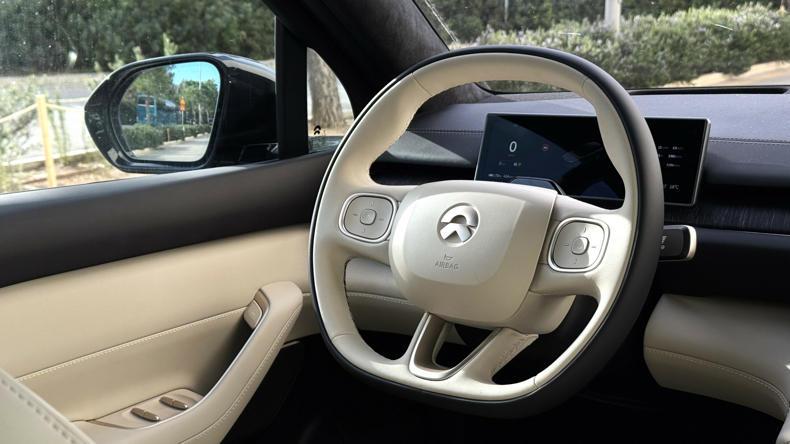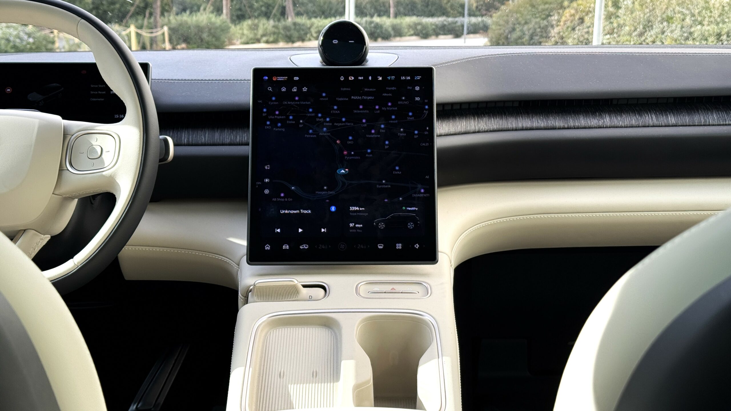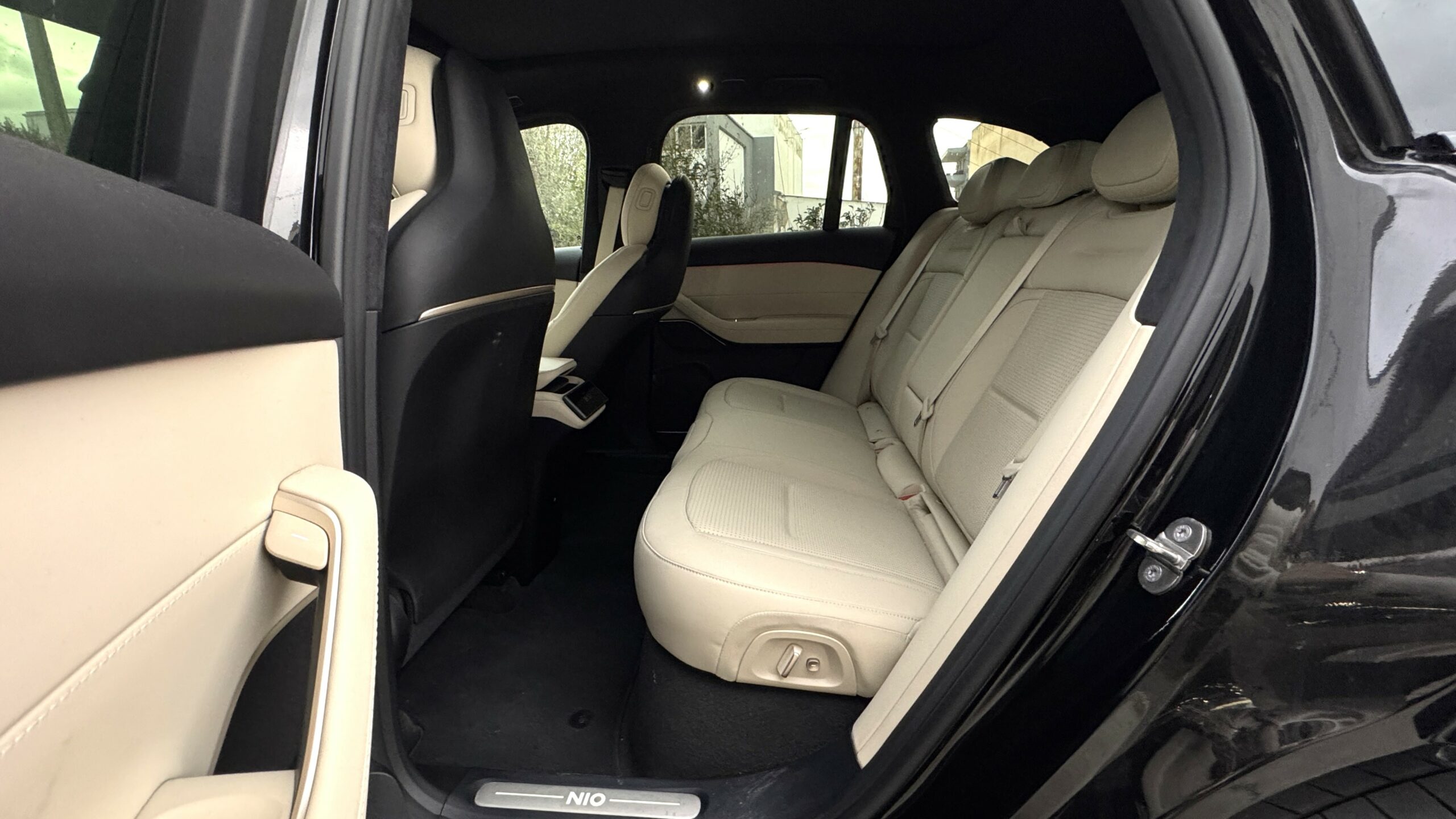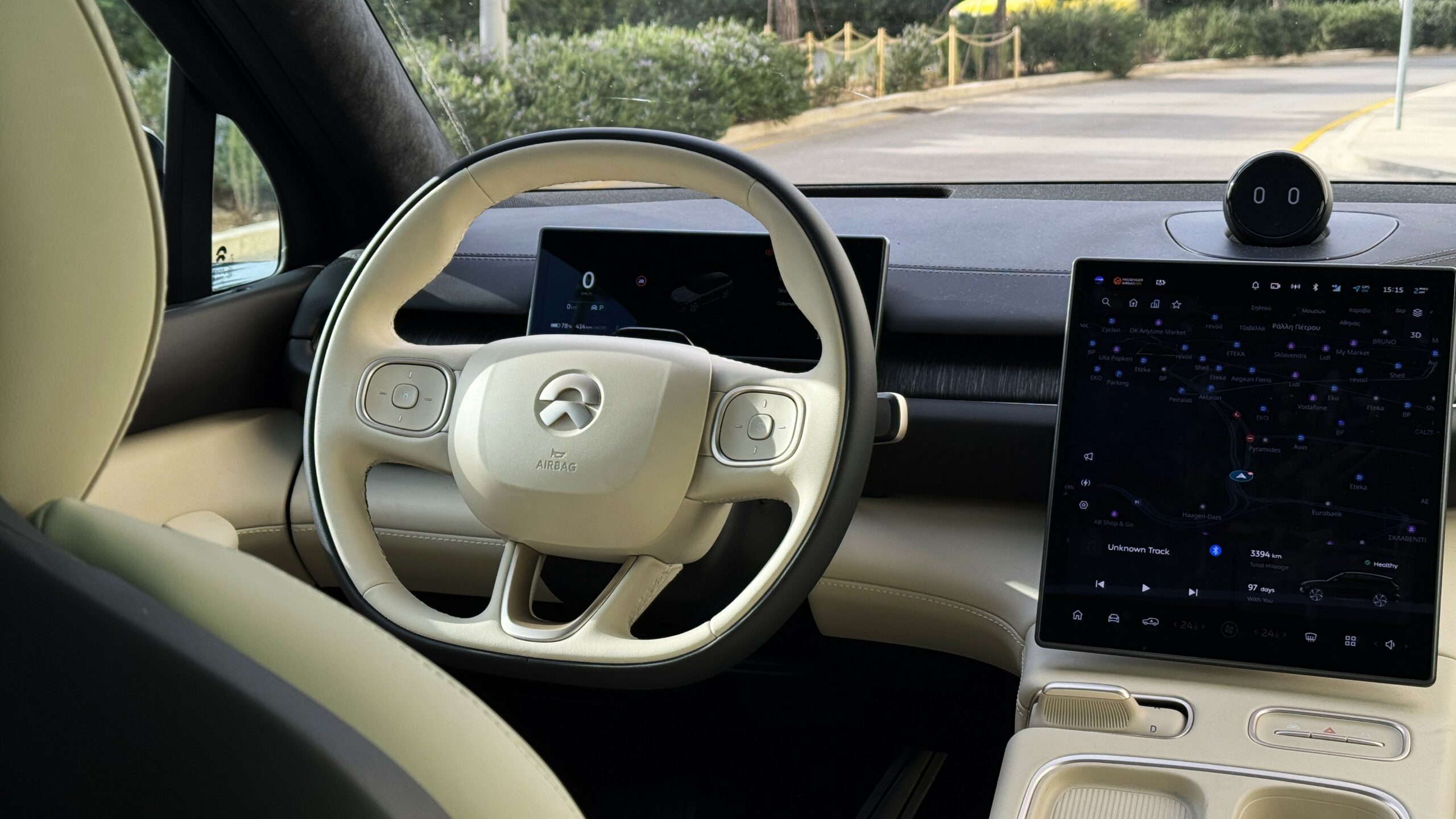 Κεντρικό ρόλο παίζει η NOMI, η ψηφιακή βοηθός της NIO. Το μικρό «ανθρωπάκι» στο ταμπλό δημιουργεί μια σχεδόν φυσική αλληλεπίδραση, καθώς με φωνητικές εντολές μπορείς να της ζητήσεις σχεδόν τα πάντα: από ρυθμίσεις κλιματισμού μέχρι πληροφορίες ή σενάρια χαλάρωσης. Η κάθετη οθόνη αφής 12,8″ κυριαρχεί στο κέντρο και από εκεί ελέγχονται σχεδόν όλες οι λειτουργίες. Λόγω απουσίας φυσικών διακοπτών όλα γίνονται μέσω της οθόνης, όμως, ευτυχώς, οι φωνητικές εντολές της NOMI μετριάζουν το συγκεκριμένο θέμα. Μοναδικό μείον, η έλλειψη Apple CarPlay και Android Auto, κάτι που θα θέλαμε και ευελπιστούμε να διορθωθεί μελλοντικά μέσω κάποιας αναβάθμισης. Ο ψηφιακός πίνακας οργάνων 10,2″, το Head-Up Display 9,3″ και η επιπλέον οθόνη αφής 6,6″ για τους πίσω επιβάτες ολοκληρώνουν ένα τετραπλό ψηφιακό περιβάλλον.