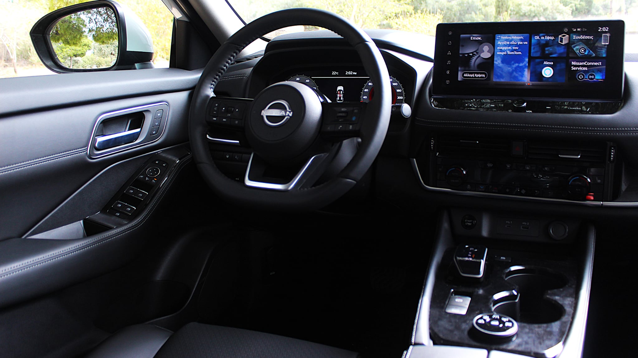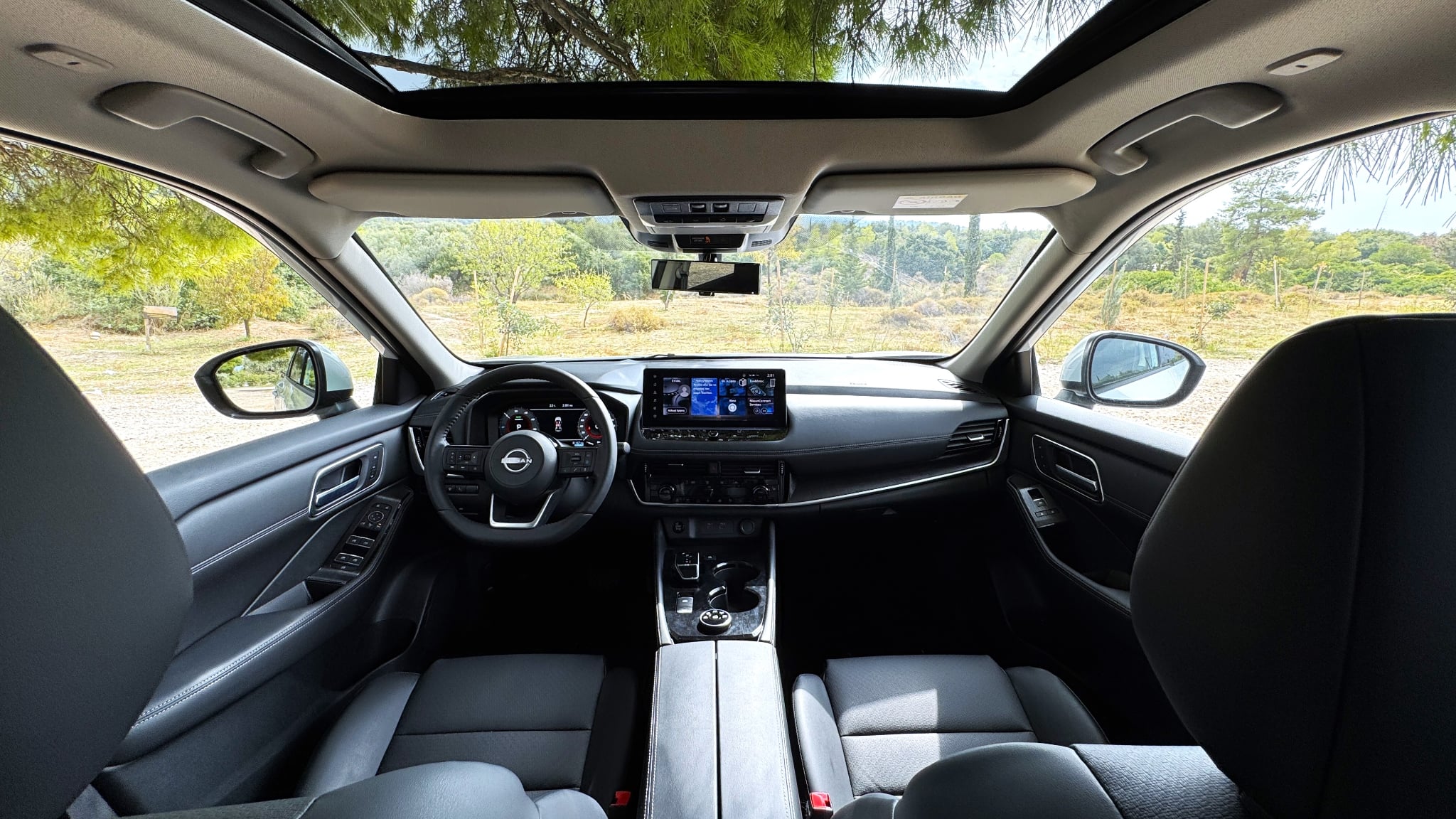 Στο εσωτερικό του X-Trail η αίσθηση είναι ποιοτική. Η καμπίνα υποδέχεται έως και 7 επιβάτες, προσφέροντας άνετα καθίσματα και θερμαινόμενα για τις δύο πρώτες σειρές. Το σύστημα πολυμέσων ενσωματώνει μεγάλη οθόνη αφής 12″, ψηφιακό πίνακα οργάνων ενώ η έκδοση Techna που είχαμε στα χέρια μας για δοκιμή, διαθέτει ανοιγόμενη ηλιοροφή που πλημμυρίζει τον χώρο με φως.