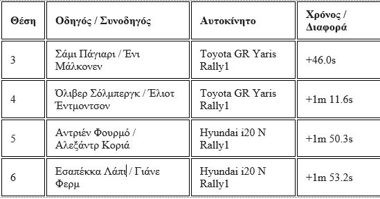 Χάρη στο ιστορικό 1-2-3-4 που πέτυχαν τα πληρώματά της, η ιαπωνική ομάδα κατάφερε να διευρύνει σημαντικά το προβάδισμά της στην κορυφή του πίνακα. Στο πρωτάθλημα των κατασκευαστών, η Toyota έχει ήδη αρχίσει να χτίζει μια σημαντική διαφορά, απέχοντας 52 βαθμούς από τη δεύτερη Hyundai. Το ενδιαφέρον τώρα στρέφεται στην Αφρική και το θρυλικό Ράλλυ Σαφάρι στην Κένυα, το οποίο θα διεξαχθεί από τις 12 έως τις 15 Μαρτίου, προσφέροντας ένα εντελώς διαφορετικό σκηνικό με υψηλές θερμοκρασίες και σκληρές, βραχώδεις διαδρομές.