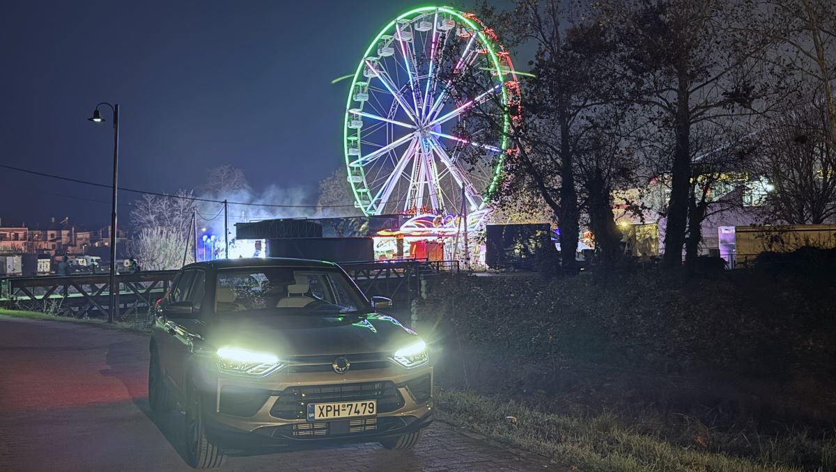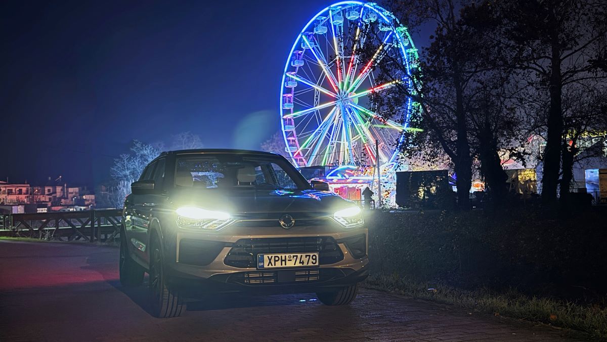 Στο φόντο του Μύλου των Ξωτικών, το KGM Korando δείχνει να εντάσσεται αρμονικά στη γιορτινή ατμόσφαιρα. Η σύγχρονη και καθαρή σχεδίασή του, με τη φαρδιά μάσκα, τα αιχμηρά φωτιστικά σώματα και τις έντονες ακμές στο καπό και στα πλαϊνά, του χαρίζει μια στιβαρή αλλά όχι επιθετική παρουσία. Οι λεπτομέρειες στους προφυλακτήρες και τα φτερά υπογραμμίζουν τον SUV χαρακτήρα του, ενώ το μεταλλικό γκρι χρώμα της δοκιμής μας αντανακλούσε ευχάριστα τα χριστουγεννιάτικα φώτα γύρω του.