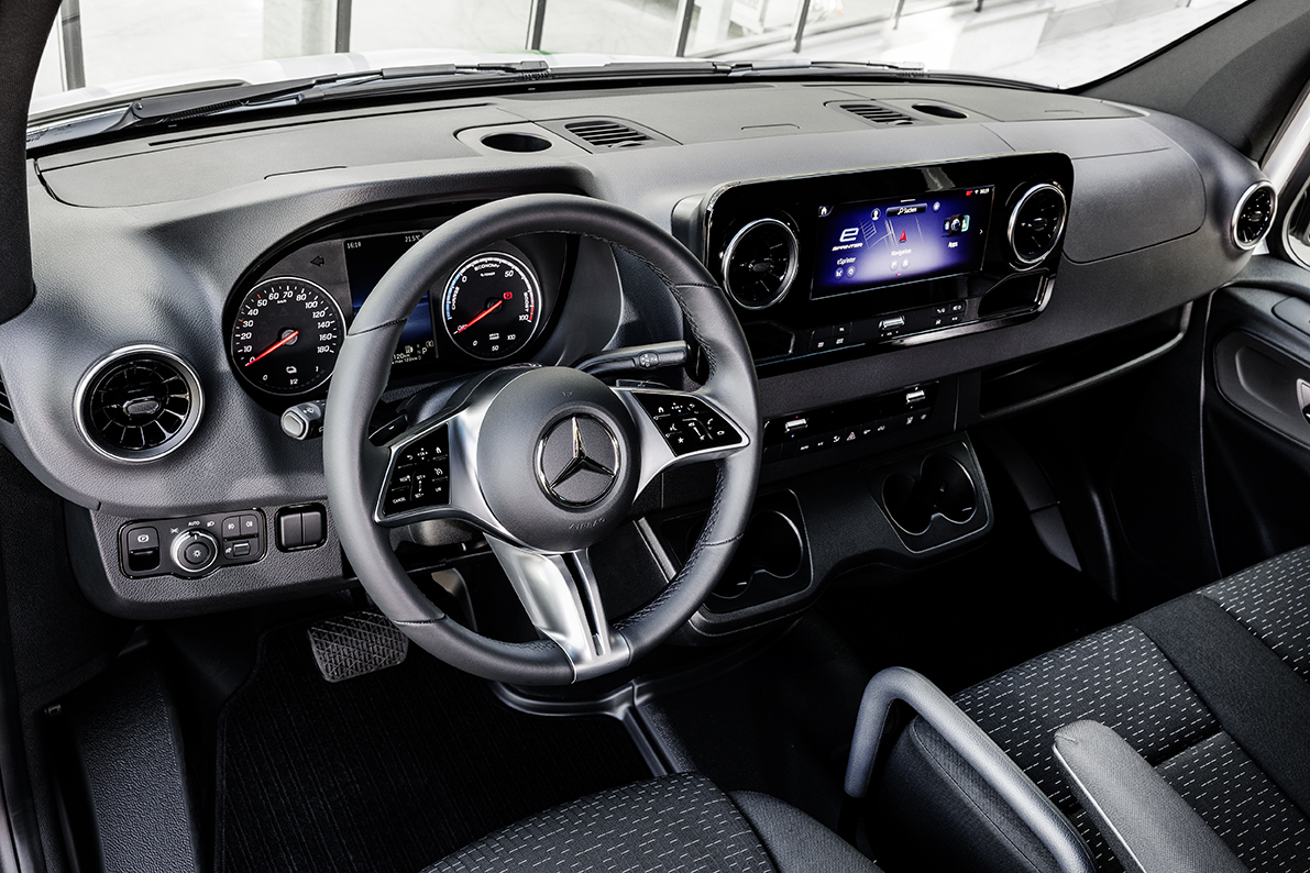 Στην έκδοση BASE, το eSprinter εξοπλίζεται, μεταξύ άλλων, με το σύστημα Infotainment MBUX με νέα γενιά τηλεματικής, οθόνη 26 cm (10,25 ιντσών) και κάμερα οπισθοπορείας, πίνακα οργάνων με έγχρωμη οθόνη πολλαπλών ενδείξεων, νέο τιμόνι πολλαπλών λειτουργιών με λειτουργία αναγνώρισης απομάκρυνσης χεριών από το τιμόνι, σύστημα ελέγχου πίεσης ελαστικών (μπροστά/πίσω), αισθητήρα βροχής και αυτόματο φωτισμό πορείας, ενεργό σύστημα υποβοήθησης διατήρησης λωρίδας, σύστημα υποβοήθησης ορίων ταχύτητας Intelligent Speed Assist και Cruise Control καθώς και το ATTENTION ASSIST στο βασικό εξοπλισμό. Η έκδοση PRO περιλαμβάνει, μεταξύ άλλων και επιπλέον της έκδοσης BASE, υποβοήθηση εκκίνησης σε ανηφόρα, τιμόνι με δυνατότητα ρύθμισης ύψους και κλίσης, καθώς και θύρα USB 5V. Με την έκδοση SELECT, οι επαγγελματίες απολαμβάνουν επίσης δερμάτινο τιμόνι, κάθισμα ανέσεων για τον οδηγό, μονάδα χειρισμού ανέσεων και προβολείς LED High Performance συμπεριλαμβανομένου προσαρμοζόμενου συστήματος υποβοήθησης φώτων μεγάλης σκάλας.