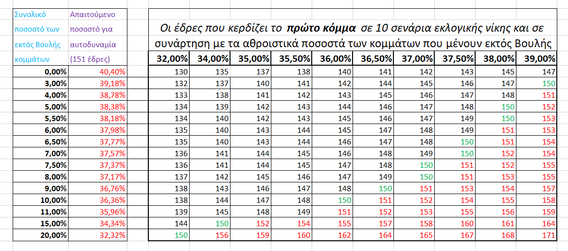 Όσο κι αν μοιάζει οξύμωρο, το καθοριστικό στοιχείο της αυτοδυναμίας είναι το ποσοστό που θα λάβουν τα κόμματα τα οποία δεν θα εκπροσωπηθούν στη βουλή, αν δεν πιάσουν το όριο του απαιτούμενου 3% στην επικράτεια. Έτσι όπως διαμορφώνεται ο εκλογικός νόμος, όσο μεγαλύτερο είναι το ποσοστό της αναντιπροσώπευτης ψήφου τόσο… χαμηλώνει ο πήχης για την επιζητούμενη αυτοδυναμία του πρώτου κόμματος.