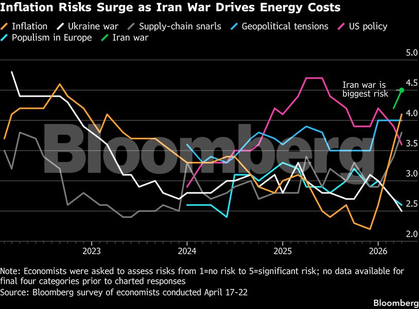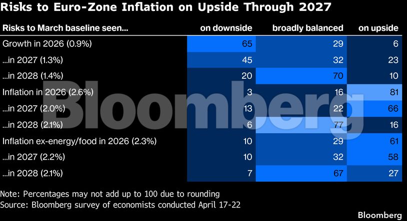 Οι προοπτικές τόσο για τον πληθωρισμό όσο και για την ανάπτυξη έχουν επιδεινωθεί από τον Μάρτιο. Οι κίνδυνοι για τον πληθωρισμό — που προβλέπεται στο 2,6% για φέτος και στο 2% το 2027 — θεωρούνται ανοδικοί, με σχεδόν 90% των αναλυτών να εκφράζει ανησυχία ότι θα παραμείνει πάνω από τον στόχο μεσοπρόθεσμα.