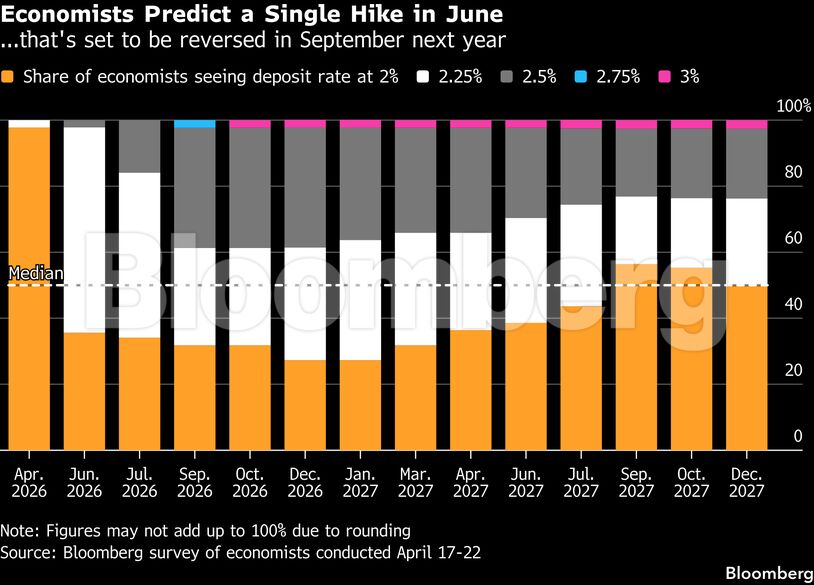 Οι μισοί από όσους προβλέπουν αύξηση τον Ιούνιο εκτιμούν ότι μέχρι το τέλος του 2027 θα υπάρξει τουλάχιστον μία μείωση επιτοκίων, με τη διάμεση πρόβλεψη να θέλει το επιτόκιο καταθέσεων να επιστρέφει στο 2% έως τον Σεπτέμβριο εκείνης της χρονιάς.