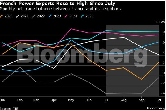 Φέτος όμως, οι καθαρές εμπορικές ροές ηλεκτρικής ενέργειας της Γαλλίας έφτασαν στο υψηλότερο επίπεδο από το 2005 και παρέμειναν σε αυτό έως τον Οκτώβριο, σύμφωνα με τα στοιχεία του διαχειριστή RTE. Η αυξημένη παραγωγή πίεσε προς τα κάτω τις εγχώριες τιμές ρεύματος, ενισχύοντας τις εξαγωγές προς την Ελβετία, το Ηνωμένο Βασίλειο και την Ιταλία.