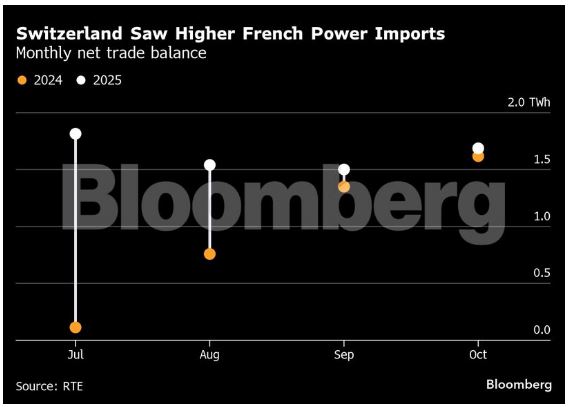Οι καθαρές εξαγωγές προς την Ελβετία αυξήθηκαν πάνω από 70% σε σχέση με πέρυσι, ενώ προς το Ηνωμένο Βασίλειο ενισχύθηκαν κατά 30%. Η Ελβετία αντιμετωπίζει προβλήματα στη δική της πυρηνική παραγωγή. O σταθμός Μπεζνάου περιόρισε τη λειτουργία του εξαιτίας του φετινού καύσωνα, καθώς οι υψηλές θερμοκρασίες των ποταμών οδήγησαν σε μειωμένη ισχύ και μερικές διακοπές λειτουργίας. Το εργοστάσιο Γκέσγκεν βρίσκεται εκτός λειτουργίας από τον Μάιο λόγω τεχνικών προβλημάτων που εντόπισαν οι ρυθμιστικές αρχές.