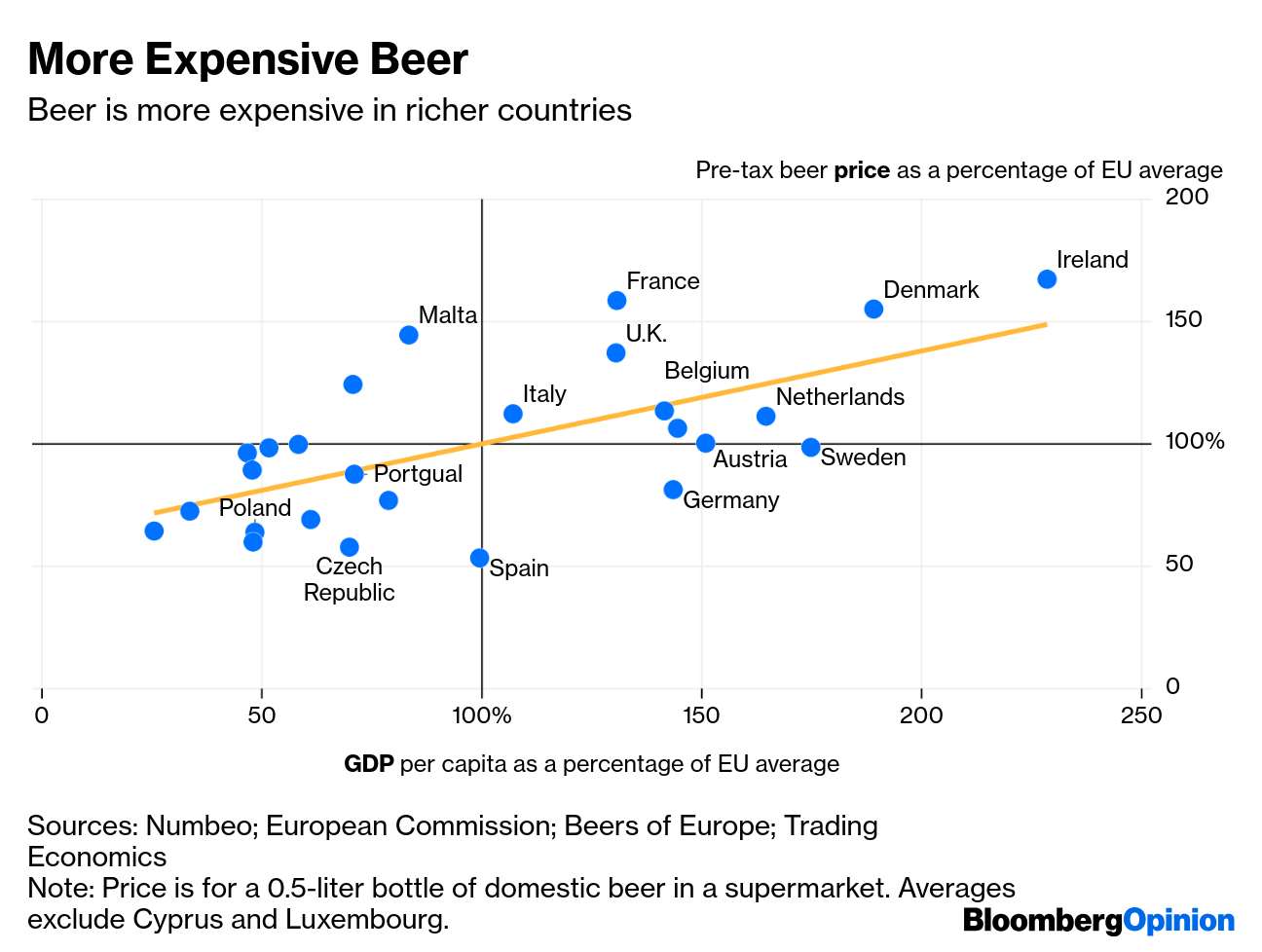 Όμως, αποκλίσεις υπάρχουν και στις τιμές προ φόρων. Οι ερευνητές που έχουν μελετήσει τις διαφορές στις τιμές των τροφίμων τις αποδίδουν, μεταξύ άλλων λόγων, στις καταναλωτικές συνήθειες και τα επίπεδα πλούτου που διαφέρουν από χώρα σε χώρα. Η τιμή της μπύρας συσχετίζεται αρνητικά με το επίπεδο κατανάλωσης μιας χώρας και θετικά με το κατά κεφαλήν εισόδημα. Για να το πούμε ωμά, σε μια πλούσια χώρα που πίνει λιγότερη μπύρα, ένα μπουκάλι μπύρα θα είναι ακριβότερο.