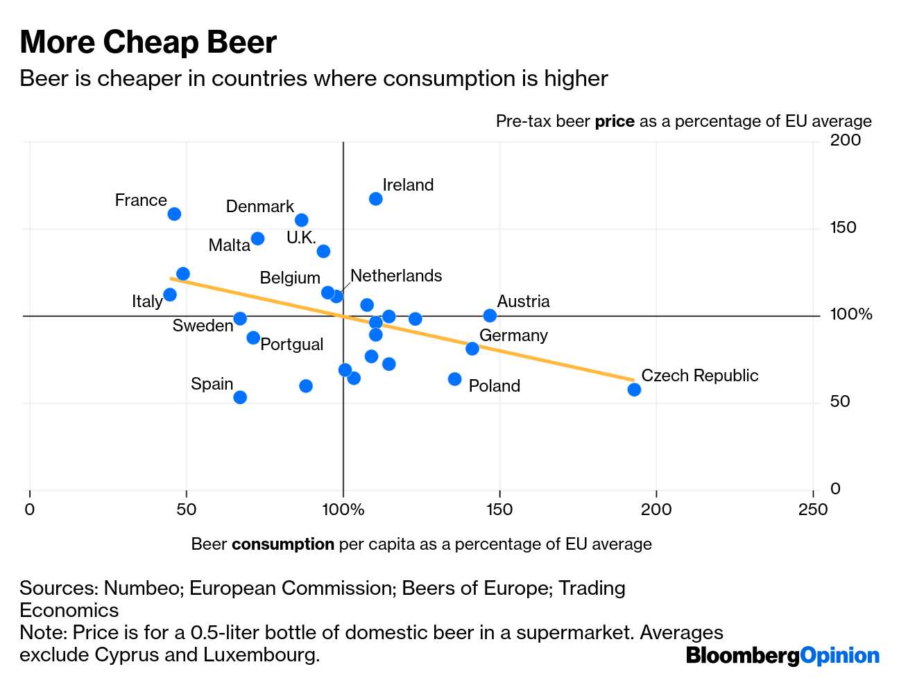 Αυτοί οι δύο παράγοντες, ωστόσο, εξηγούν περίπου το ήμισυ της διακύμανσης των τιμών των μπύρας προ φόρων. Αυτό είναι ταυτόχρονα πολύ, αλλά και όχι αρκετό. Η μπύρα μαζικής αγοράς είναι ένα σχετικά απλό προϊόν όσον αφορά τα συστατικά, τις απαιτούμενες επενδύσεις και την απαιτούμενη ποσότητα εργασίας (οι οικονομίες κλίμακας είναι μεγάλες). Το υπόλοιπο της διακύμανσης πρέπει να εξηγείται από επιρροές που δεν είναι τόσο εύκολο να αναλυθούν, όπως η πανευρωπαϊκή χονδρική και λιανική υποδομή – και τα ανταγωνιστικά τοπία που διαμορφώνουν τη δυνατότητα των μεγάλων ζυθοποιών να διαμορφώνουν τις τιμές, όπως έκανε η AB InBev στο Βέλγιο. Ακόμη και σε μια ήπειρο χωρίς εσωτερικά σύνορα, αυτό που θεωρητικά θα έπρεπε να είναι μια άκρως ανταγωνιστική αγορά συχνά δεν είναι, όπως αποδεικνύει η παρούσα υπόθεση.