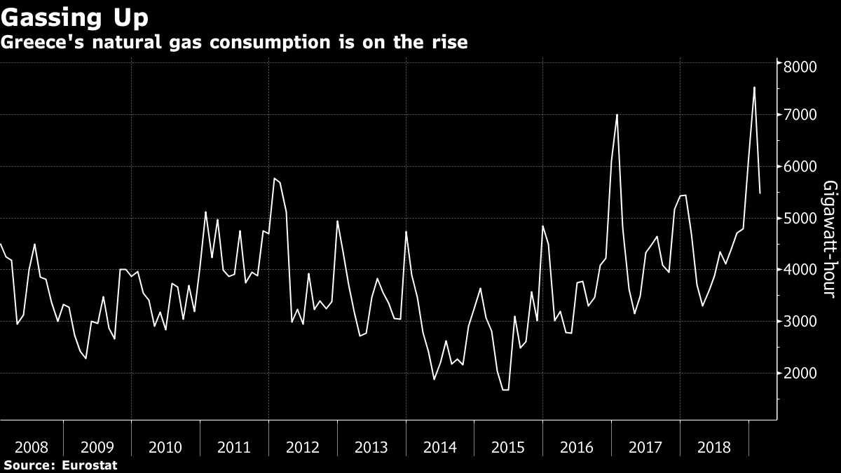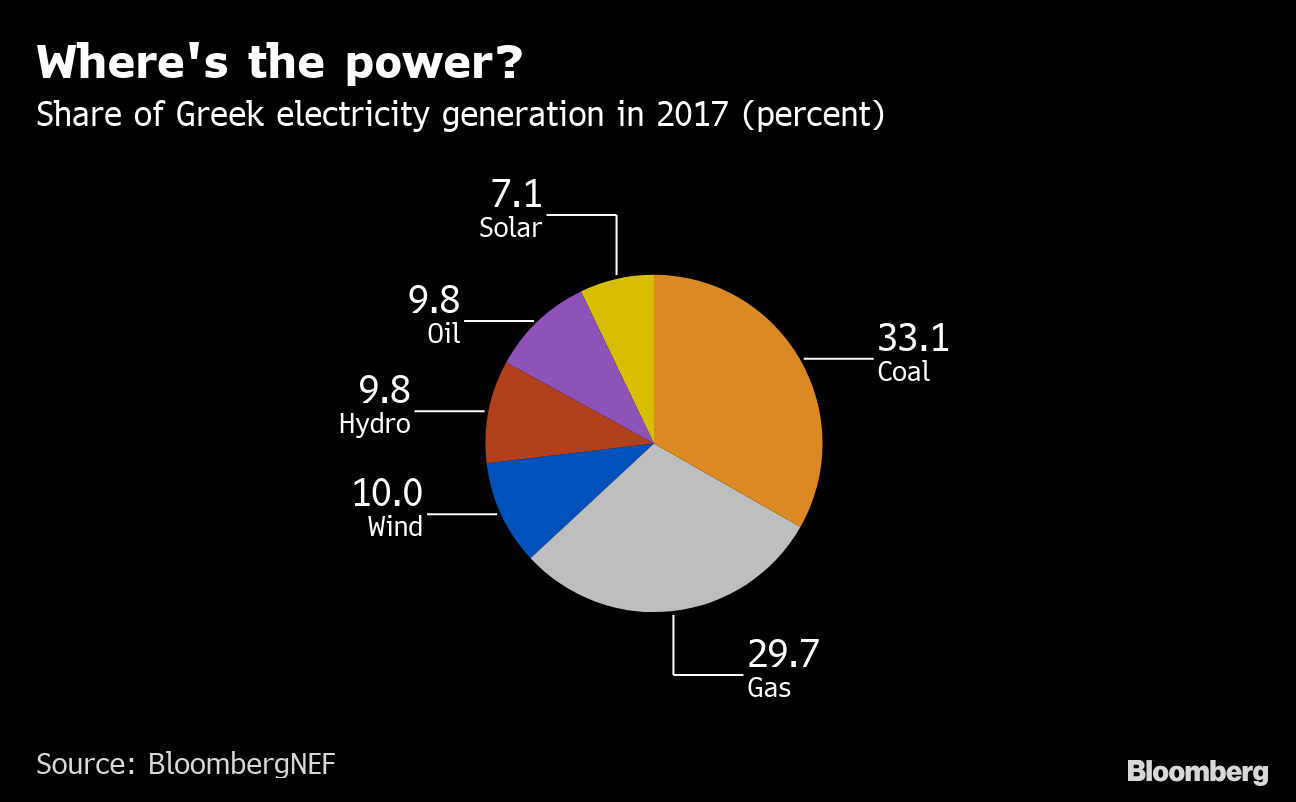 Η Ελλάδα επεκτείνει την κατανάλωση φυσικού αερίου και ανανεώσιμων πηγών ενέργειας σε μια προσπάθεια να περιορίσει την εξάρτηση από τον άνθρακα (λιγνίτη), ο οποίος σήμερα παρέχει το 30% περίπου  της ηλεκτρικής ενέργειας της χώρας, όταν μόλις πριν από μια δεκαετία συνεισέφερε το 55%, σύμφωνα με στοιχεία που συνέταξε το BloombergNEF. Τα εργοστάσια που λειτουργούν με φυσικό αέριο παρήγαγαν σχεδόν το 30% της ενέργειας το 2017, αυξάνοντας τη συμβολή τους πάνω από 10 ποσοστιαίες μονάδες την τελευταία τριετία, σύμφωνα με τα πιο πρόσφατα στοιχεία του BNEF.