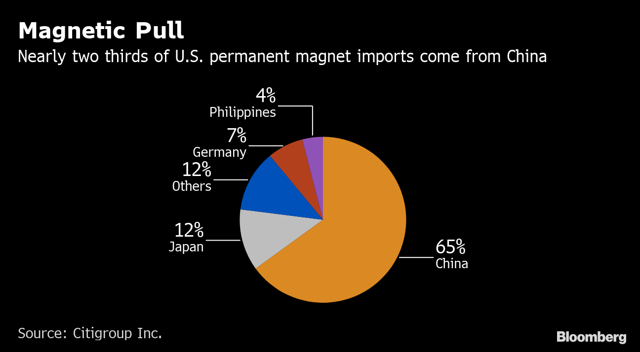 Οι εξαγωγές μαγνητών της Κίνας ανήλθαν το προηγούμενο έτος σε 1,7 δισεκατομμύρια δολάρια, ανέφερε η Citigroup. Αν και οι ΗΠΑ εισήγαγαν περίπου 395 εκατομμύρια δολάρια, συμπεριλαμβανομένων 257 εκατομμυρίων δολαρίων από την Κίνα, αυτό αποκρύπτει τις πιθανές οικονομικές ζημίες σε πολλές βιομηχανίες, καθώς οι μαγνήτες που χρησιμοποιούνται σε μικροσκοπικούς κινητήρες επιτελούν βασικές λειτουργίες σε αυτοκίνητα, ανεμογεννήτριες και πολλές οικιακές συσκευές.