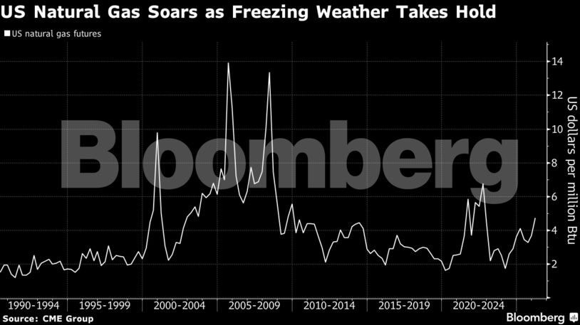 Μέσα σε δύο ημέρες τα συμβόλαια φυσικού αερίου στις ΗΠΑ κατέγραψαν άλμα άνω του 50%, καθώς πολικές θερμοκρασίες πλήττουν εκτεταμένες περιοχές της χώρας, εκτοξεύοντας τη ζήτηση για θέρμανση. Οι τιμές οδεύουν προς τη μεγαλύτερη εβδομαδιαία άνοδο των τελευταίων 35 ετών τουλάχιστον.