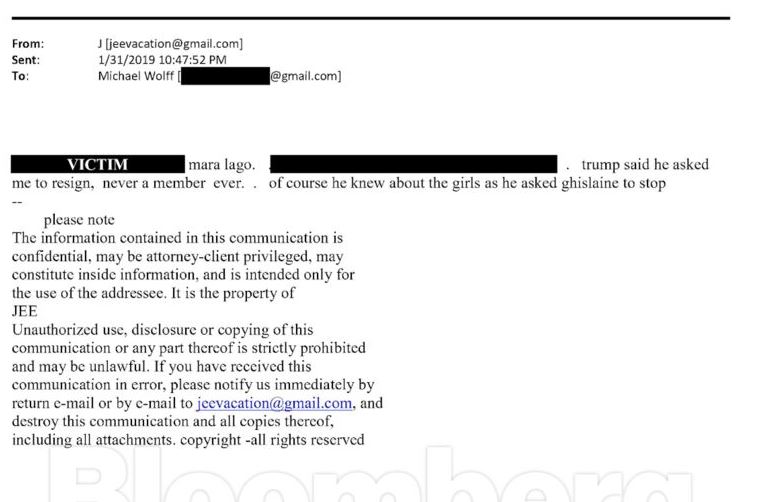 Σε ένα ξεχωριστό email με τον συγγραφέα Μάικλ Γουλφ από το 2019, ο Έπσταϊν έγραψε ότι «ο Τραμπ είπε ότι μου ζήτησε να παραιτηθώ, ποτέ δεν ήμουν μέλος ποτέ», φαίνεται να αναφέρεται στο αίτημα του προέδρου να φύγει από το κλαμπ Μαρ-α-Λάγκο. Ο Έπσταϊν πρόσθεσε: «Φυσικά ήξερε για τα κορίτσια, καθώς ζήτησε από τη Γκισλέιν να σταματήσει».