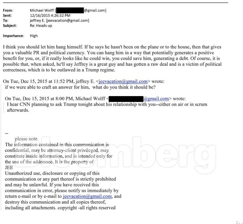 Ο Έπσταϊν και ο Γουλφ, σε μια ανταλλαγή email του 2015, συζήτησαν επίσης το ενδεχόμενο να ερωτηθεί ο Τραμπ από το CNN για τη σχέση τους το βράδυ μιας προκριματικής εκλογής του Ρεπουμπλικανικού Κόμματος. Ο Γουλφ πρότεινε ότι ο Έπσταϊν είχε επιρροή πάνω στον Τραμπ, ο οποίος τότε έθετε υποψηφιότητα για πρόεδρος.