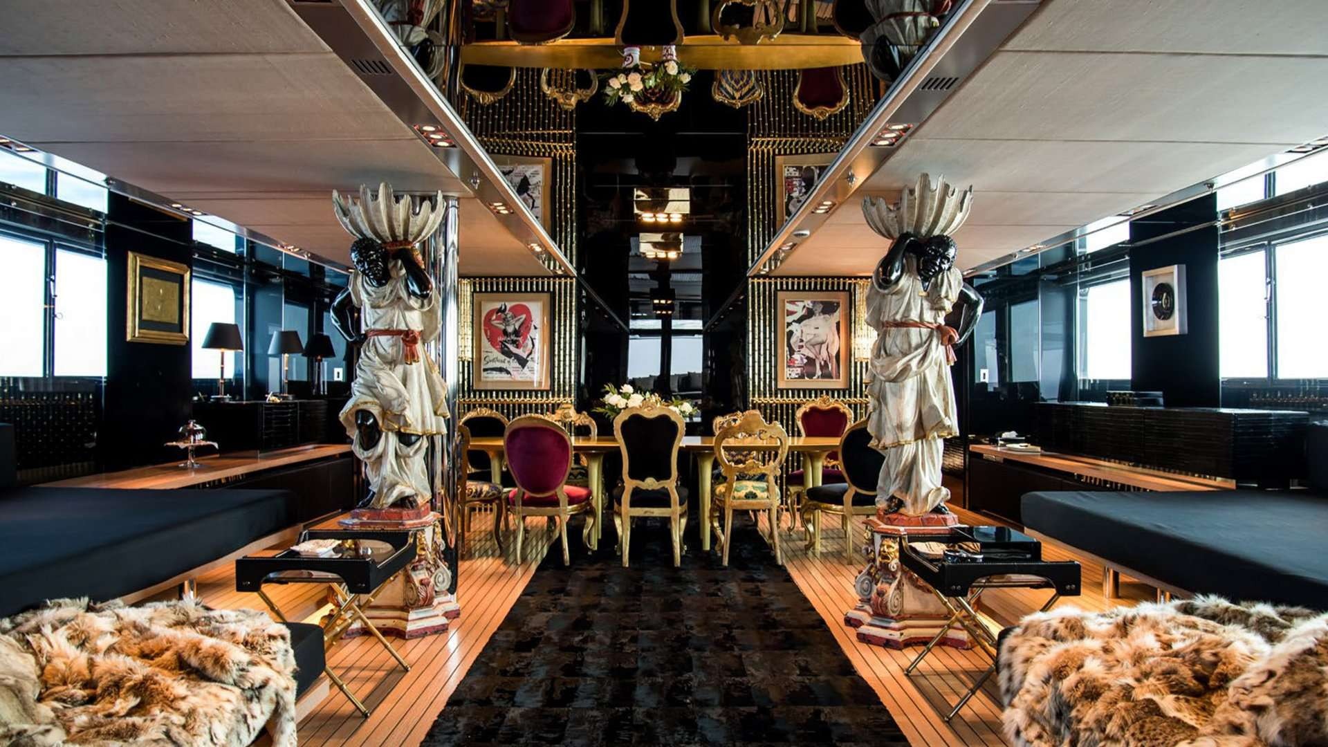 Το εσωτερικό του χαρακτηρίζεται από μια αδιαμφισβήτητη παλέτα μπλε χρωμάτων, σκούρων ξύλων και βραζιλιάνικου μαρμάρου, με καθρέφτες και προσεκτικά ρυθμισμένο φωτισμό που χρησιμοποιείται για να διαμορφώσει την ατμόσφαιρα και όχι να την κυριαρχήσει. Η σχεδιαστική γλώσσα ξεδιπλώνεται σε όλο το σκάφος, γινόμενη προοδευτικά πιο σκοτεινή και πιο καθηλωτική προς τα ανώτερα καταστρώματα.