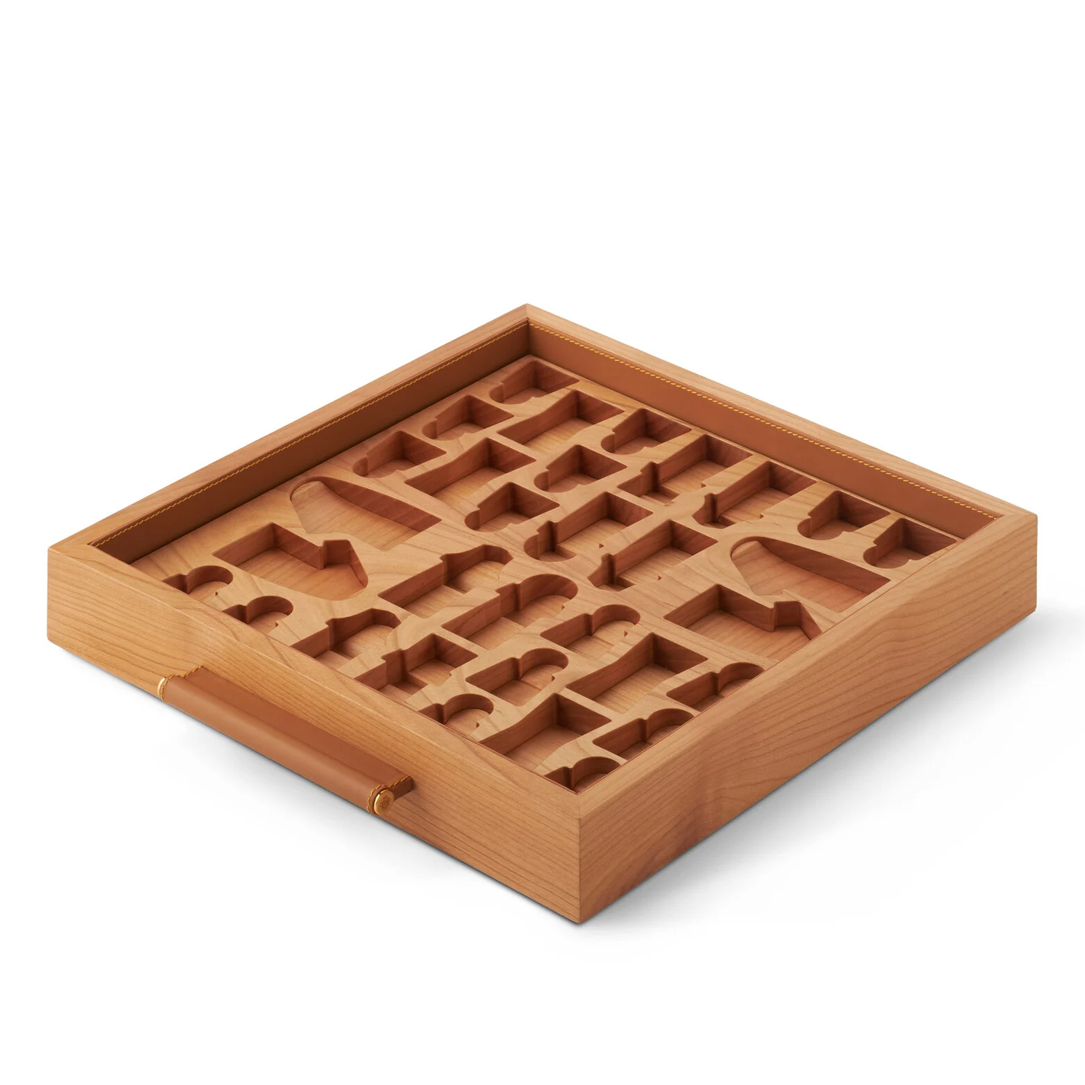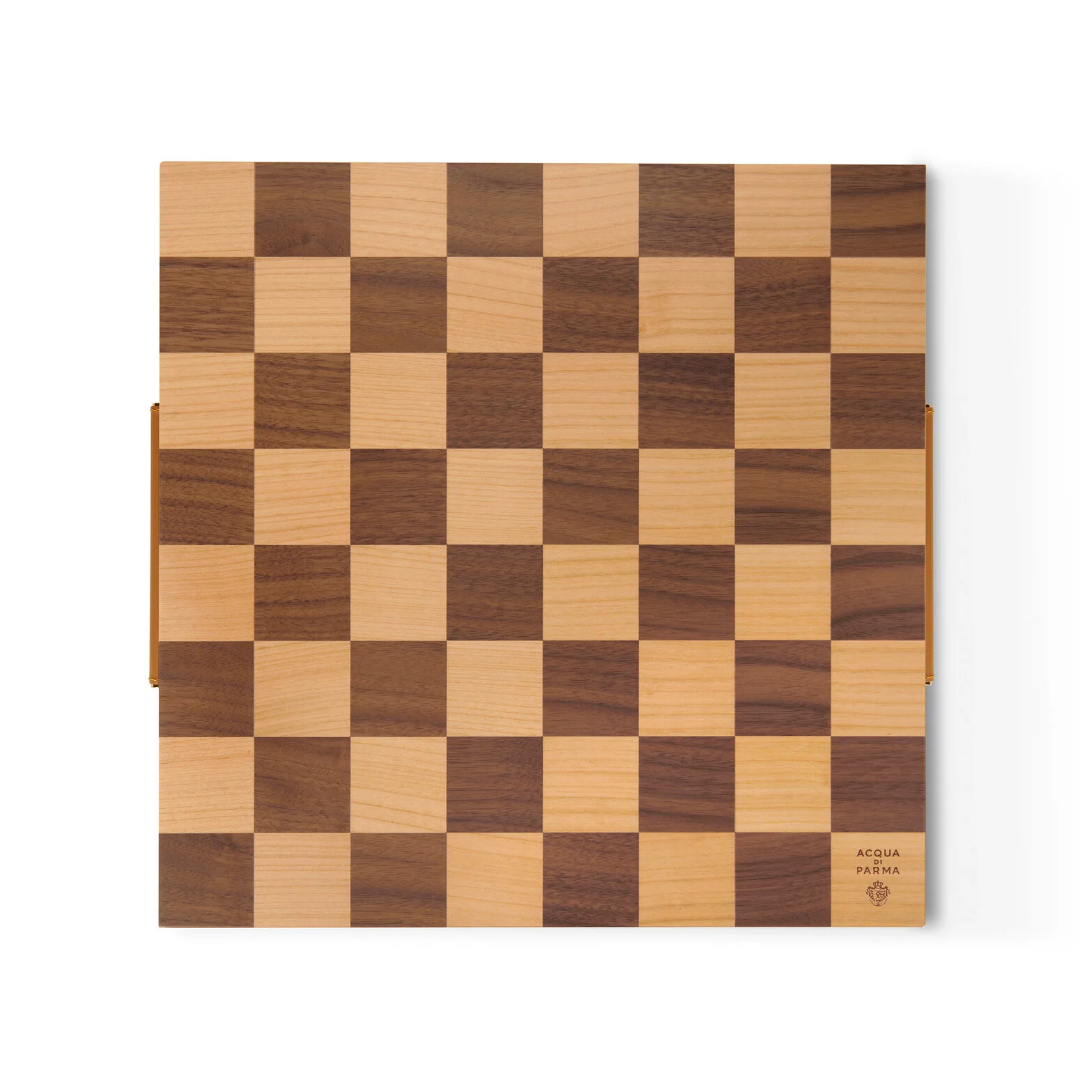 Τα άκρα της σκακιέρας είναι διακοσμημένα με την χαρακτηριστική κίτρινη ραφή της Acqua di Parma, ενώ το λογότυπο Acqua di Parma είναι χαραγμένο με λέιζερ στο ξύλο και το δερμάτινο λογότυπο είναι θερμοτυπωμένο στο κέντρο του εσωτερικού δίσκου.