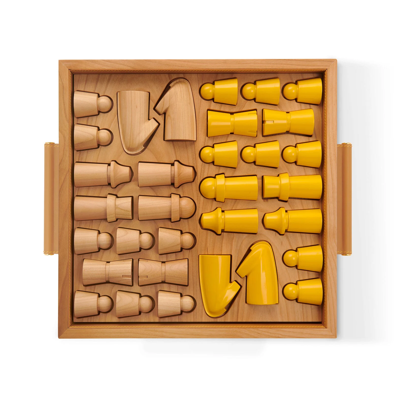 Στο εσωτερικό του, το σετ περιλαμβάνει 32 χειροποίητα πιόνια εμπνευσμένα από το καπάκι του εμβληματικού μπουκαλιού Art Deco του οίκου, χωρισμένα σε δύο μοναδικά στρατόπεδα: το ένα κατασκευασμένο από καφέ φυσικό ξύλο κερασιάς και το άλλο από ξύλο αχλαδιάς, λακαρισμένο στο χαρακτηριστικό κίτρινο χρώμα της Acqua di Parma.