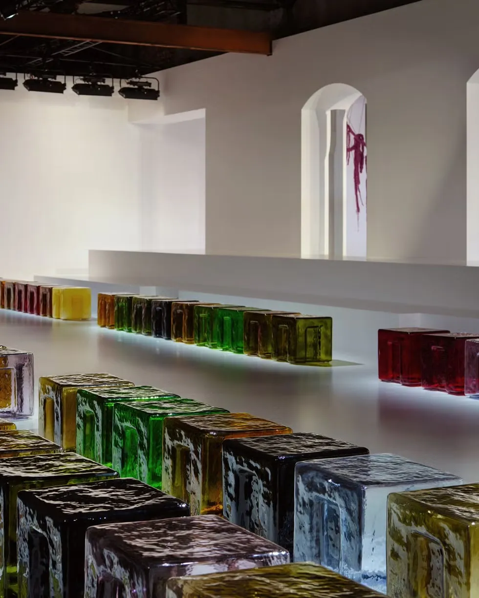Τα γυάλινα σκαμπό έκαναν το ντεμπούτο τους κατά τη διάρκεια της παρουσίασης της πρώτης συλλογής της Louise Trotter για τη Bottega Veneta, στην Εβδομάδα Μόδας του Μιλάνου, τον Σεπτέμβριο του 2025. Τοποθετήθηκαν εκεί από τον ιταλικό οίκο εύστοχα και σίγουρα εντυπωσίασαν.