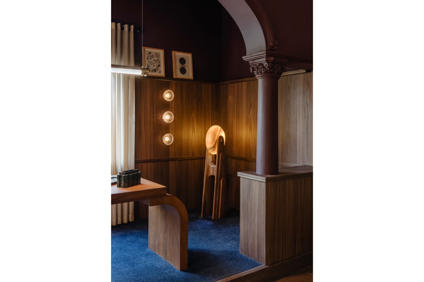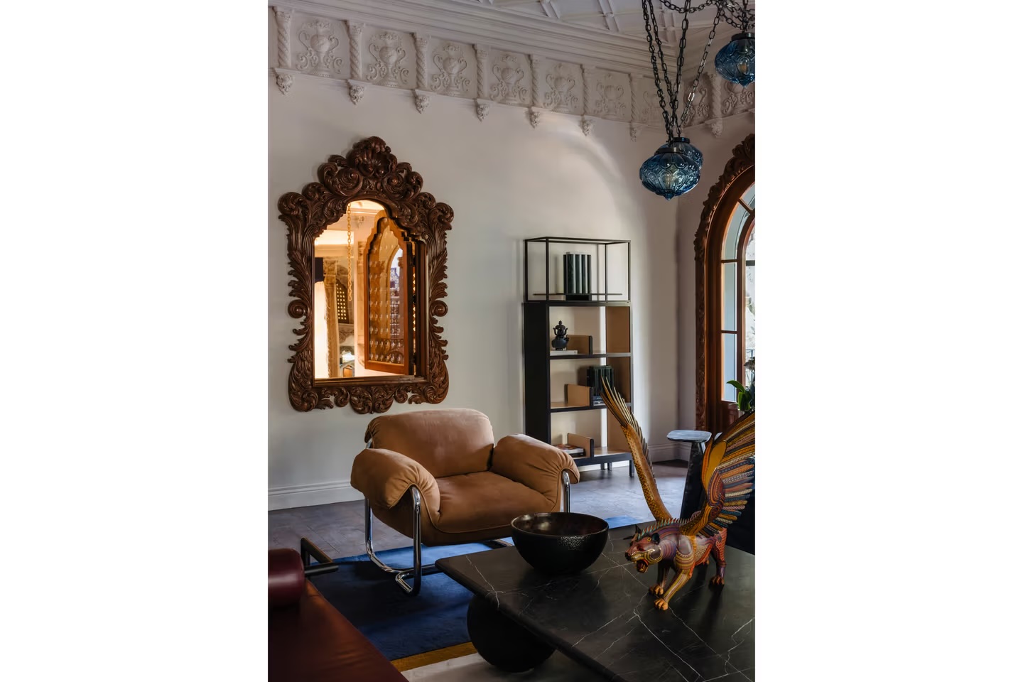 Η αποκατάσταση και ο σχεδιασμός του χώρου πραγματοποιήθηκαν από το γραφείο C Cúbica Arquitectos, σε άμεση συνεργασία με Μεξικανούς σχεδιαστές, τεχνίτες και καλλιτέχνες, σε πολλαπλά επίπεδα της κατοικίας. Τα αυθεντικά αρχιτεκτονικά στοιχεία διατηρήθηκαν και συνδυάστηκαν με ειδικά σχεδιασμένα έπιπλα, κεραμικά, υφάσματα και έργα τέχνης, τα οποία μοιάζουν οργανικά ενσωματωμένα στον χώρο και όχι απλώς τοποθετημένα ως σκηνικό. Η κεραμική κατέχει κεντρικό ρόλο σε όλη την εμπειρία, αντανακλώντας τόσο τις υλικές παραδόσεις του Μεξικού όσο και τη βαθιά σχέση της Clase Azul México με τις χειροποίητες διαδικασίες.