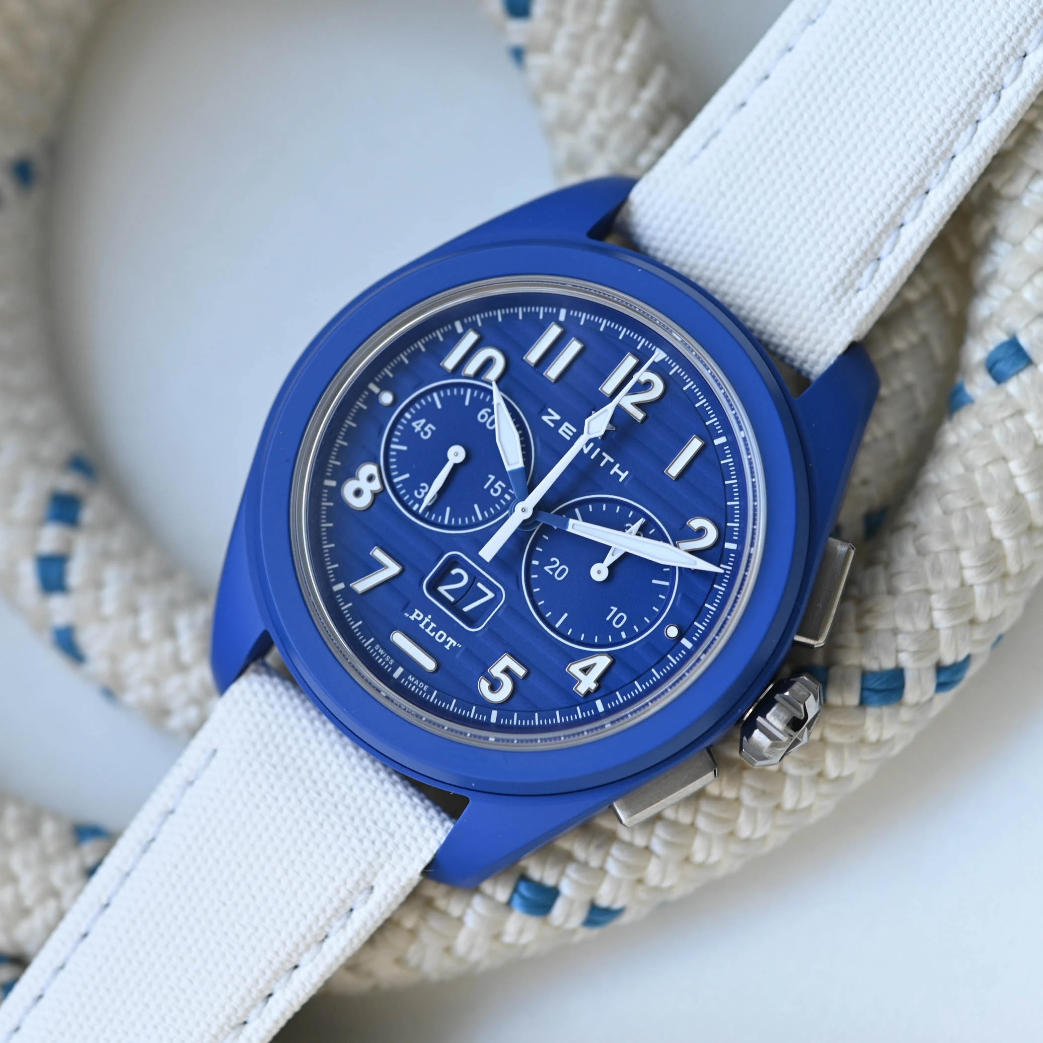 Την τριλογία ολοκληρώνει το Pilot Big Date Flyback 160th Anniversary Edition, μια άμεση αναφορά στην ιστορική σχέση της ZENITH με την αεροπορία. Η κάσα 42,5 χιλιοστών από μπλε κεραμική με μικροαμμοβολημένο φινίρισμα πλαισιώνει ένα κυματοειδές καντράν με μεγάλους φωσφορίζοντες αραβικούς αριθμούς. Ο μηχανισμός El Primero 3652 ενσωματώνει big date με πατενταρισμένη αλλαγή σε 0,007 δευτερόλεπτα και λειτουργία flyback, επιτρέποντας στον πιλότο να μηδενίσει και να επανεκκινήσει τον χρονογράφο με μία μόνο κίνηση. Το ρολόι συνοδεύεται από λουρί καουτσούκ με υφή Cordura σε μπλε και λευκό, με σύστημα γρήγορης αλλαγής.