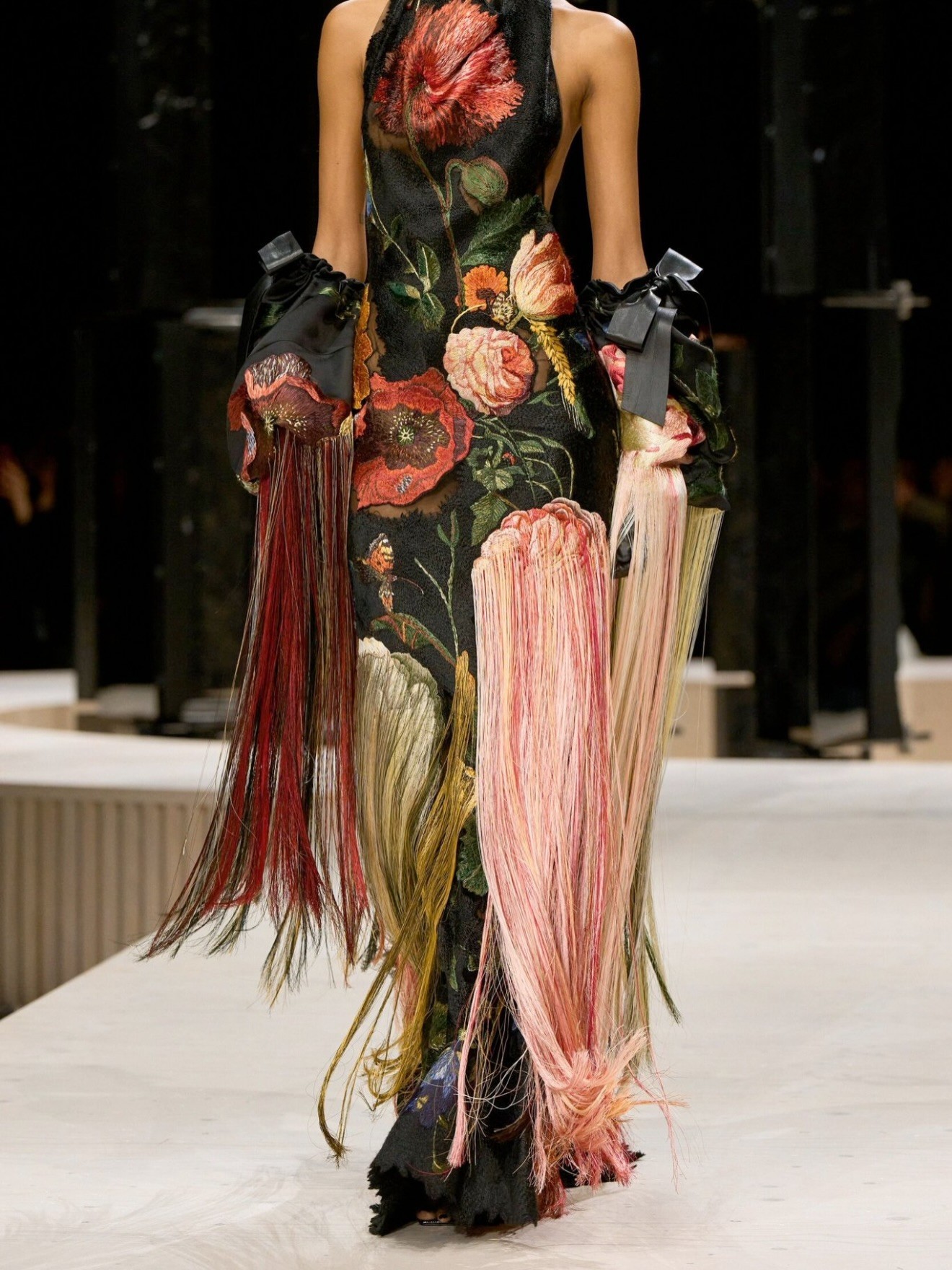 Οι αναφορές της φύσης δεν είναι διακοσμητικές αλλά δομικές, ενσωματωμένες σε μια σιλουέτα που κινείται ανάμεσα στη γλυπτική, τη ζωγραφική και τη ραπτική. Το αποτέλεσμα είναι ένα ένδυμα-κινούμενος πίνακας.