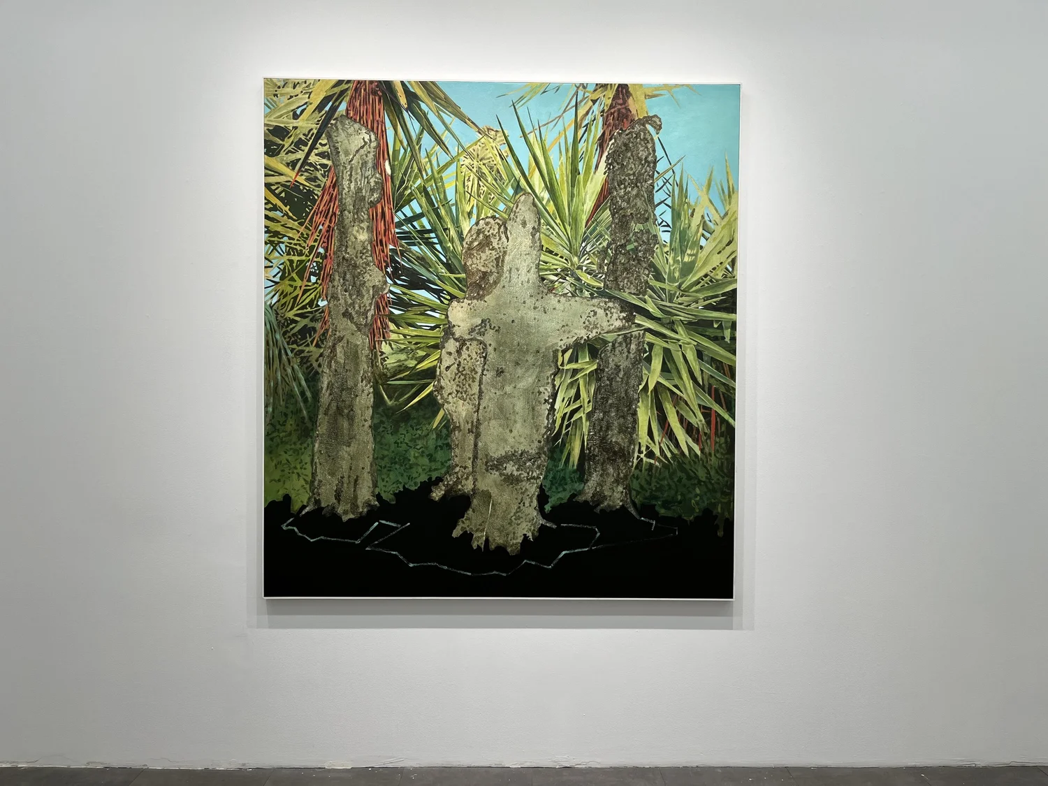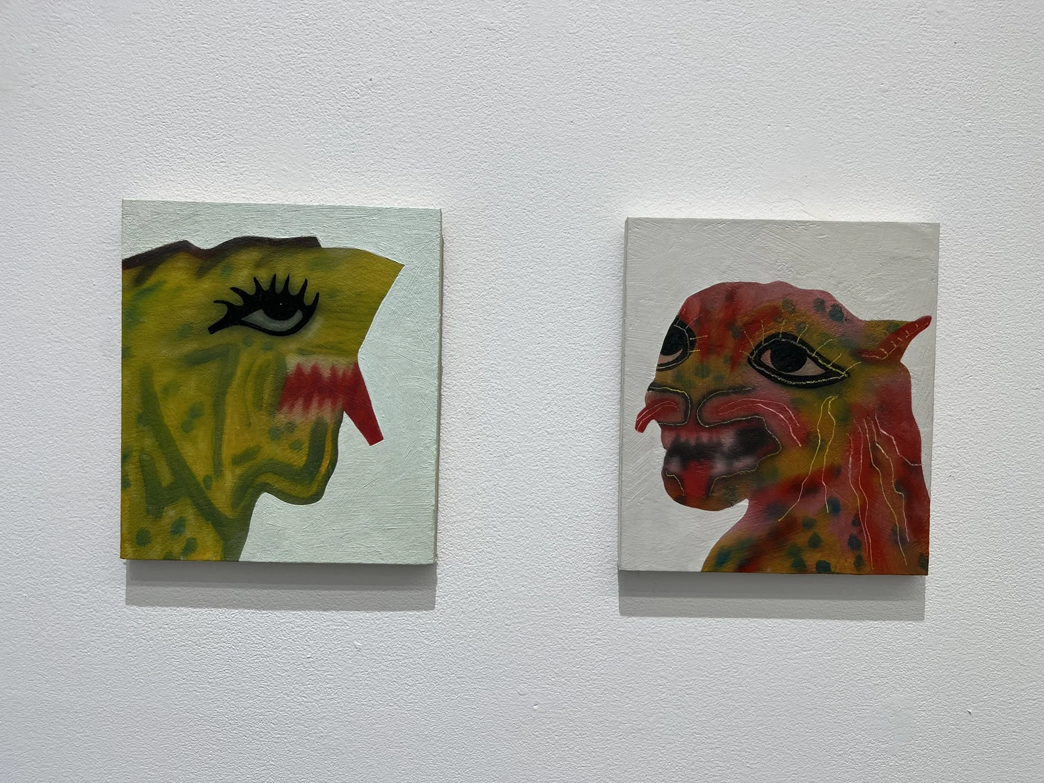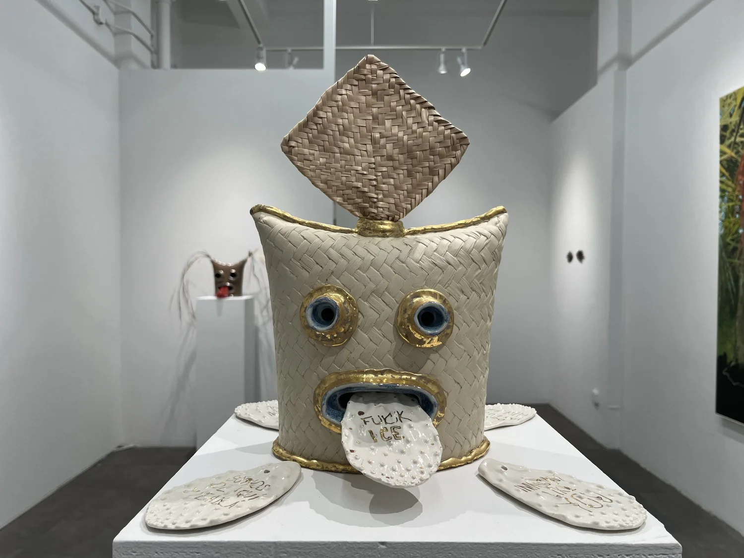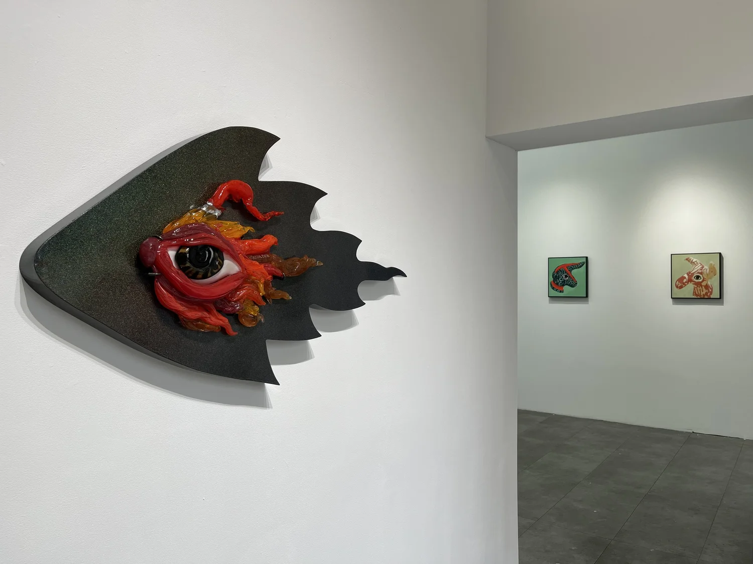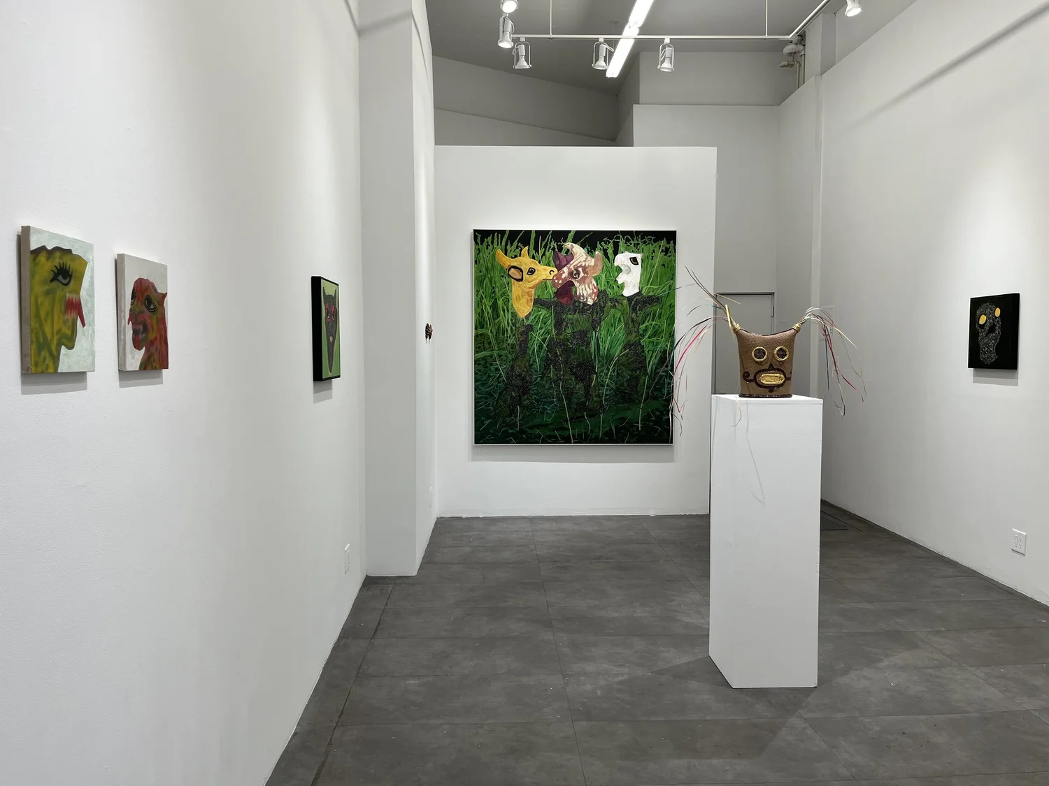 Στην έκθεση παρουσιάζονται νέα κεραμικά και μάσκες μικτής τεχνικής από τον Χιμένες Φλόρες, συμπεριλαμβανομένου και του Kutha/máscara: Lengua larga (2024). Πρόκειται για δυναμικό γλυπτό από κεραμικό υλικό που ενσωματώνει χρώση οξειδίου, γλάσο, φυσητό γυαλί και χρυσή επάληψη. Η εκτεταμένη γλώσσα μετατρέπεται σε χειρονομία ή γέφυρα μεταξύ εσωτερικού και εξωτερικού κόσμου. Ο Καμπάνης παρουσιάζει τους χαρακτηριστικούς πίνακές του, συμπεριλαμβανομένου του έργου 100 Protectresses #14 (2025). Η παρουσία και απουσία των ζώων όπως παρουσιάστηκε και σε πρόσφατη έκθεση της Γουιλελμίνα φον Μπλούμενταλ στην Ύδρα, τα συμβολικά μάτια ως μάρτυρες του τόπου και τα κορεσμένα χρώματα του περιβάλλοντος δημιουργούν καταστάσεις έκστασης και επαφής.