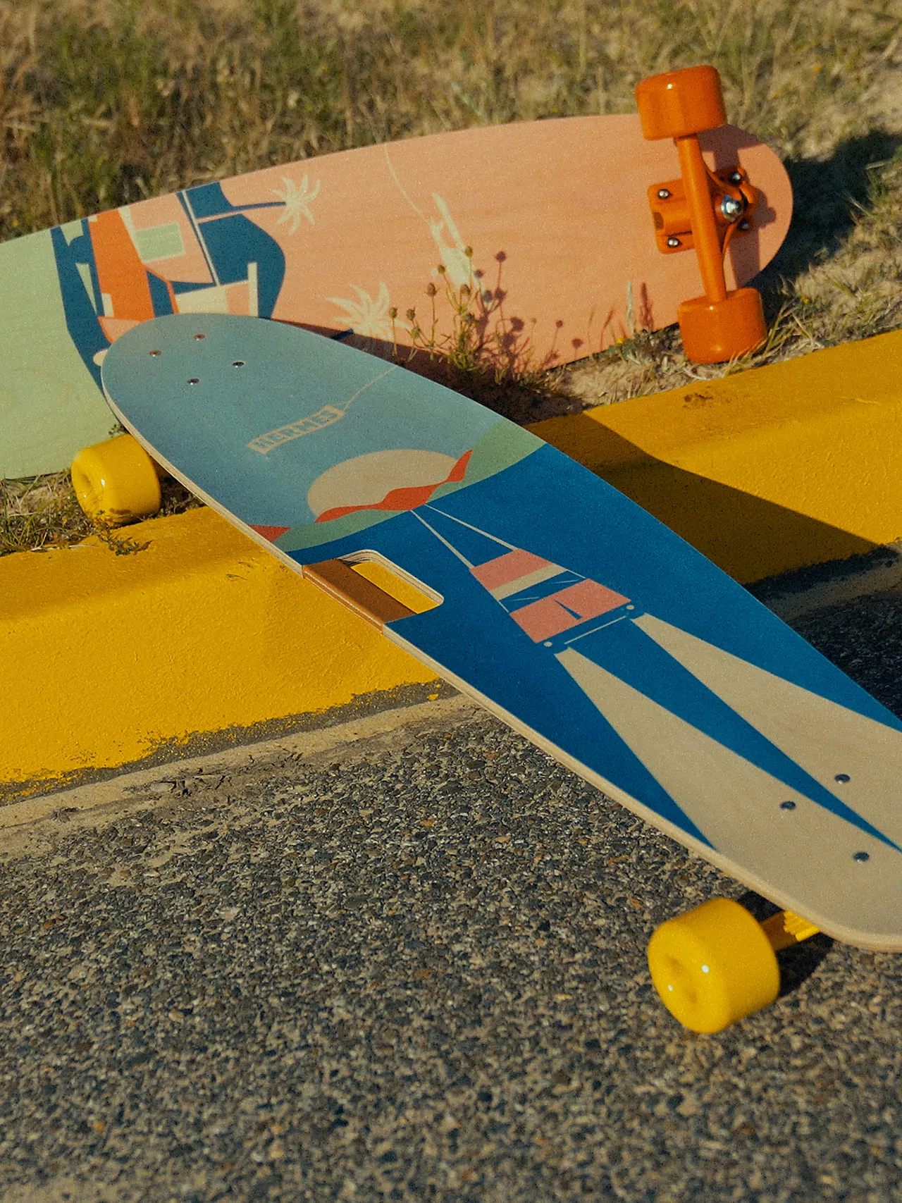 - σανίδες του σερφ, skateboard και σκι, όπου η κίνηση στο νερό ή στο βουνό συναντά τη χειροποίητη ακρίβεια και την κομψότητα,