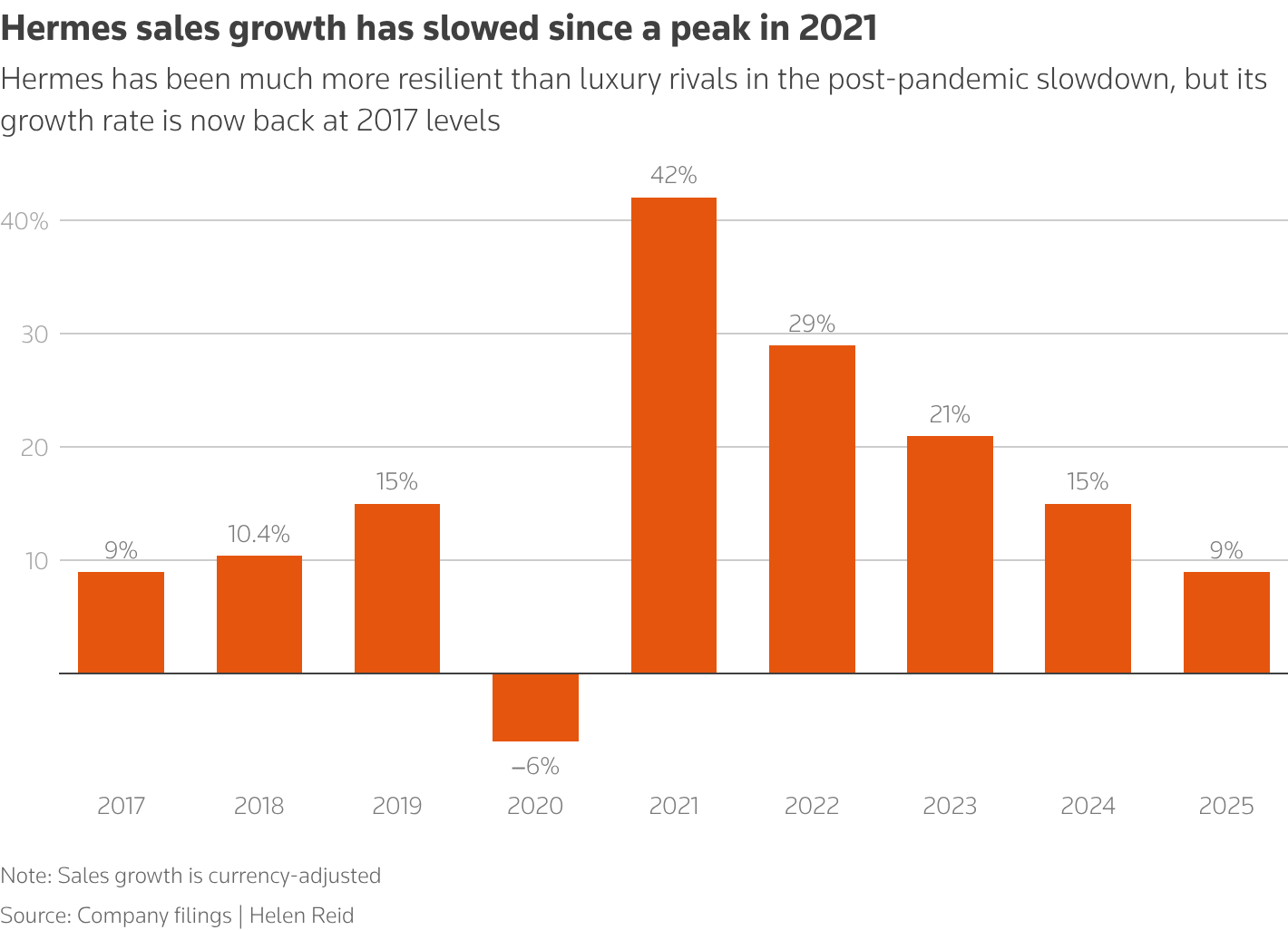 Την ίδια ώρα, οι επιδόσεις της Hermès αποκλίνουν έντονα από εκείνες άλλων ομίλων. Η LVMH Moët Hennessy Louis Vuitton κατέγραψε οριακή οργανική αύξηση 1% το ίδιο τρίμηνο, ενώ η Kering σημείωσε πτώση 3%. Η Richemont επίσης κινείται σε χαμηλότερους ρυθμούς ανάπτυξης, αν και τα αποτελέσματά της, ειδικά από τις πωλήσεις της Cartier είναι εντυπωσιακά.