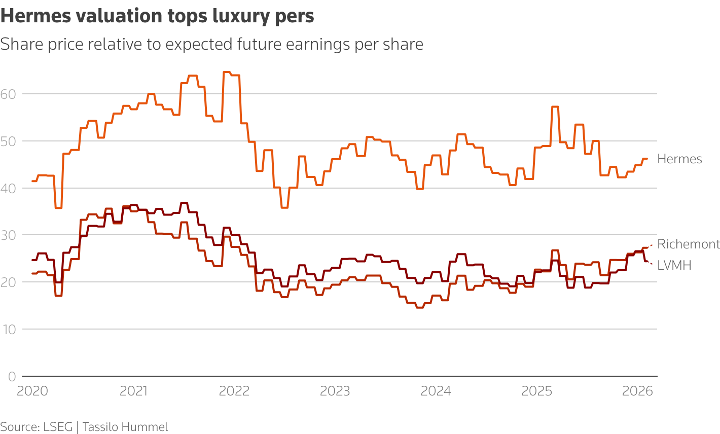 Η μετοχή της Hermès διαπραγματεύεται περίπου 45 φορές τα μελλοντικά κέρδη, σχεδόν διπλάσια αποτίμηση σε σχέση με βασικούς ανταγωνιστές, γεγονός που αντικατοπτρίζει την εμπιστοσύνη των επενδυτών στο επιχειρηματικό της μοντέλο — κάθετη ολοκλήρωση, αυστηρός έλεγχος διανομής και απόλυτη τοποθέτηση στην υπερπολυτελή κατηγορία.