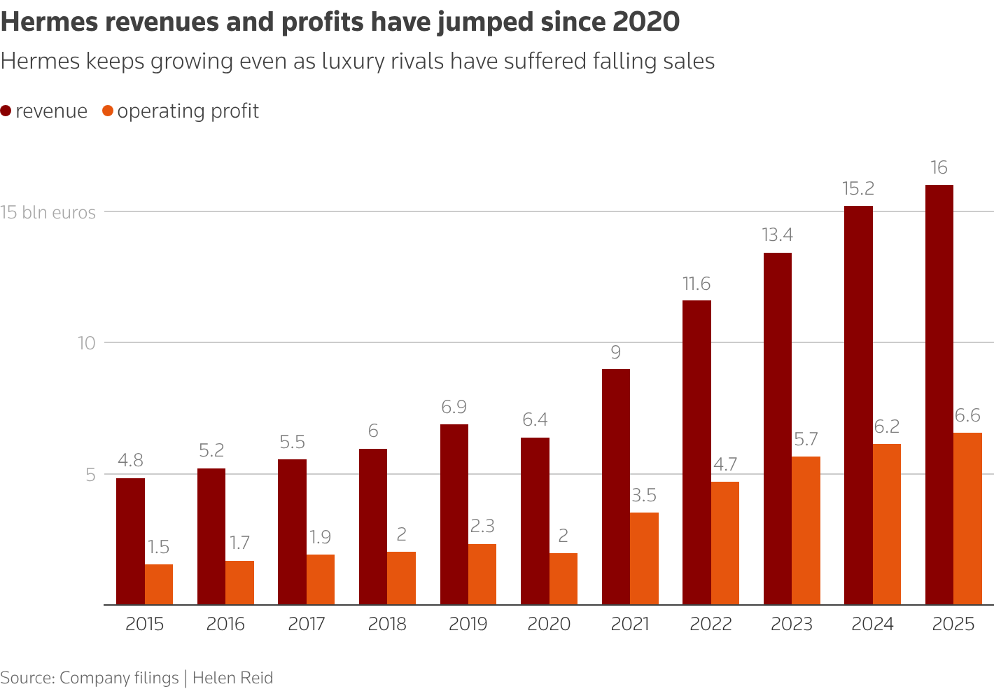 «Η Hermès βρίσκεται σε καλή θέση το 2026», έγραψε σε σημείωμά του ο διευθύνων σύμβουλος της Citi, Thomas Chauvet. Σε έναν κλάδο που βασίζεται ολοένα και περισσότερο σε μια οικονομία που διαμορφώνεται σε σχήμα «Κ», όπου οι κορυφαίες μάρκες αποσπώνται από τις υπόλοιπες, ελκύοντας τις υπέρ-εύπορες ομάδες καταναλωτών, η Hermès φαίνεται να αξιοποιεί τη στρατηγική της σπανιότητας με τρόπο που μεγιστοποιεί τόσο το κύρος όσο και τα οικονομικά αποτελέσματα.