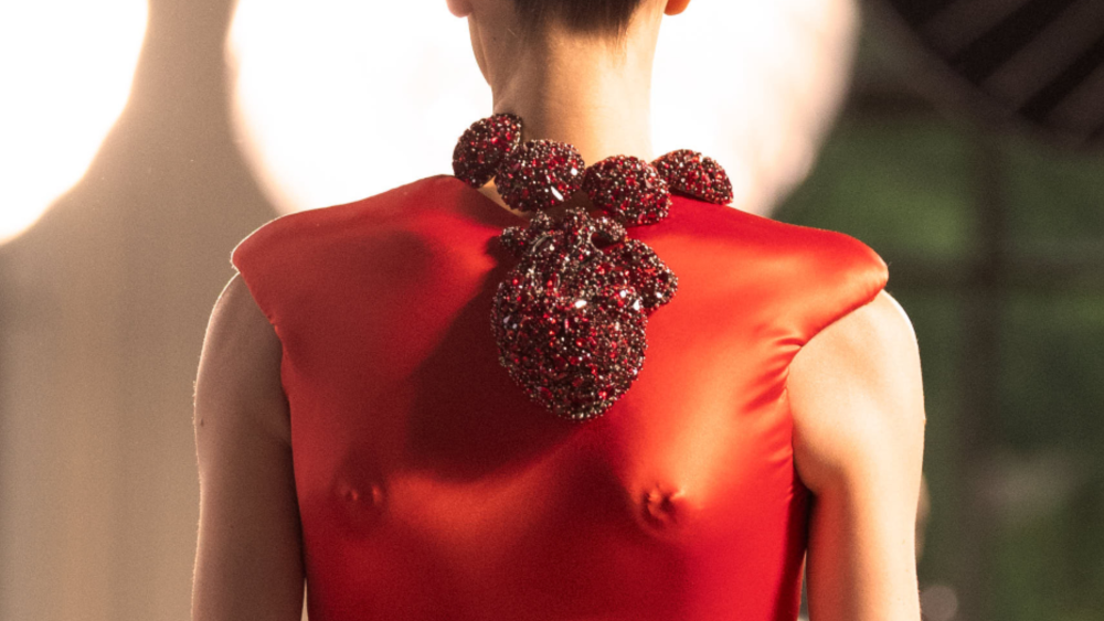 Ο Roseberry έντυσε το μοντέλο με το φόρεμα ανάποδα, έχοντας την καρδιά να χτυπά στην πλάτη, συνεχίζοντας την παράδοση της Schiaparelli, που συνδυάζει την ανατομία με την υψηλή μόδα και τα σουρεαλιστικά έργα.