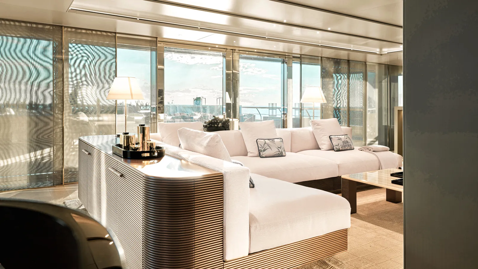 Στην πρύμνη, το ιδιωτικό σαλόνι και μπαρ προσφέρουν επιπλέον χώρο για χαλάρωση, εξοπλισμένα με καναπέ επτά θέσεων που μπορεί να μετατρέψει τον χώρο σε ιδιωτικό κινηματογράφο.