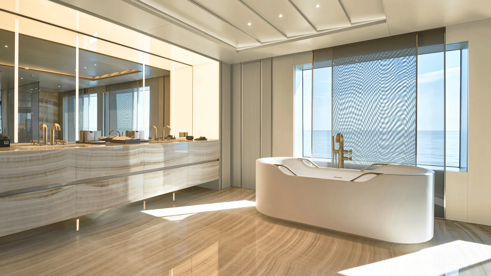 Οι καμπίνες των επισκεπτών είναι εξίσου πολυτελείς, με ιδιωτικά μπάνια διακοσμημένα με χαλαζία Azul Macaubas, μια σπάνια, φυσική πέτρα από τη Βραζιλία, γνωστή για το εντυπωσιακό, φωτεινό μπλε χρώμα της. Συνοδεύονται και από μάρμαρο Silk Georgette ή πιο απαλούς τόνους χαλαζία Taj Mahal, ένα υλικό που συνδυάζει αισθητική και τεχνική υπεροχή.