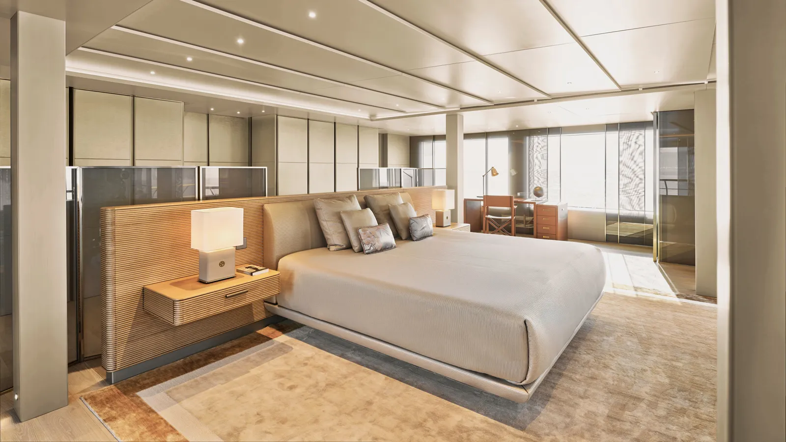 Το κατάστρωμα του ιδιοκτήτη είναι ένα απολύτως ιδιωτικό καταφύγιο. Η σουίτα πλήρους πλάτους διαθέτει κρεβάτι king size, βεστιάριο και ιδιωτική τουαλέτα με ανεξάρτητη μπανιέρα και καμπίνα ντους.