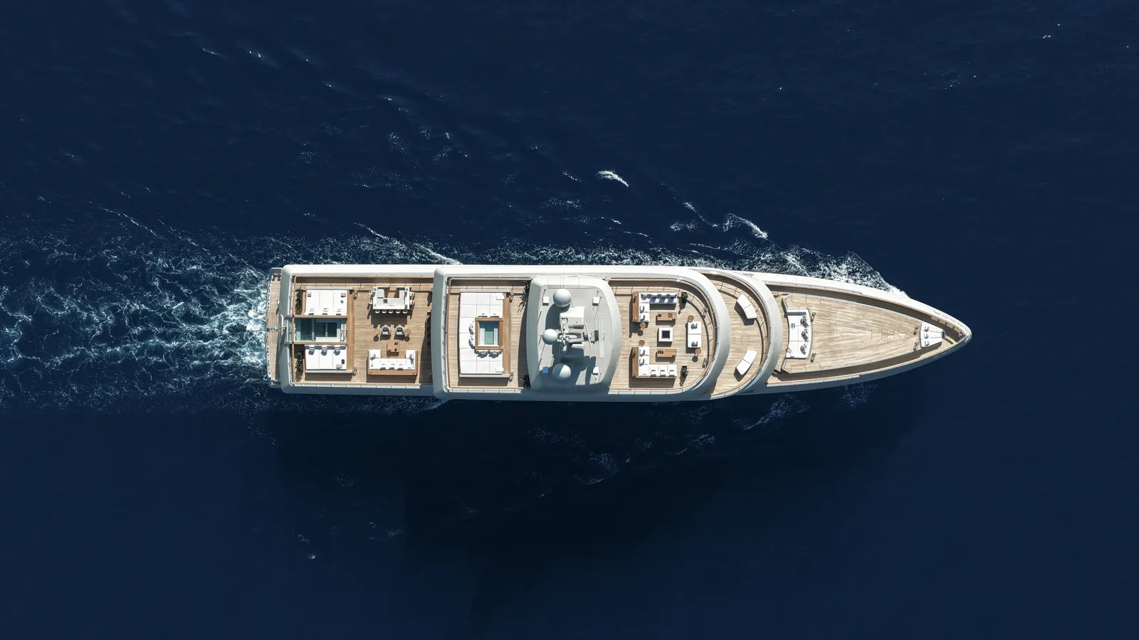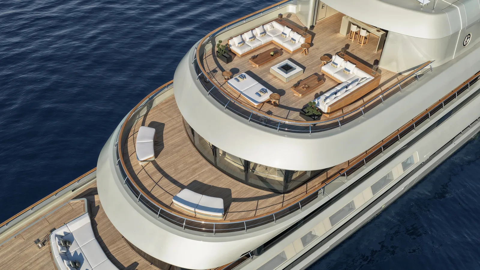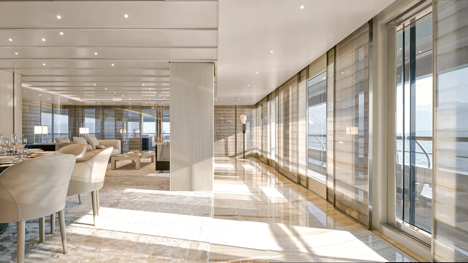 Το σατινέ χρυσό χρώμα χαρακτηρίζει το εντυπωσιακό σκάφος, διακοσμημένο με γεωμετρικούς όγκους που εναλλάσσονται με καμπύλες επιφάνειες, μεγάλα παράθυρα από το δάπεδο μέχρι την οροφή και σχεδιασμό ανώτερου καταστρώματος με αιωρούμενη βεράντα.