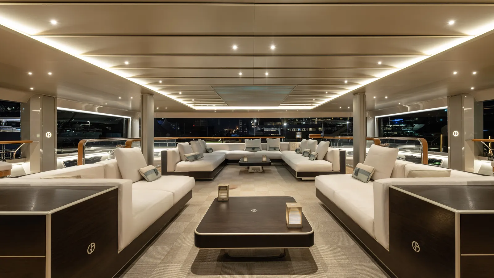 Το κατάστρωμα της γέφυρας φιλοξενεί έναν μεγάλο καναπέ σε σχήμα C, ένα μπαρ και μέσα ψυχαγωγίας, ενώ το κύριο κατάστρωμα προσφέρει επιπλέον χώρο ψυχαγωγίας με έναν καναπέ 11 θέσεων και δύο ξαπλώστρες με φινίρισμα από καρυδιά Canaletto και χρυσές, σαμπανιζέ πινελιές. Το σκάφος διαθέτει και ελικοδρόμιο που προσφέρει εύκολη πρόσβαση σε αυτό.