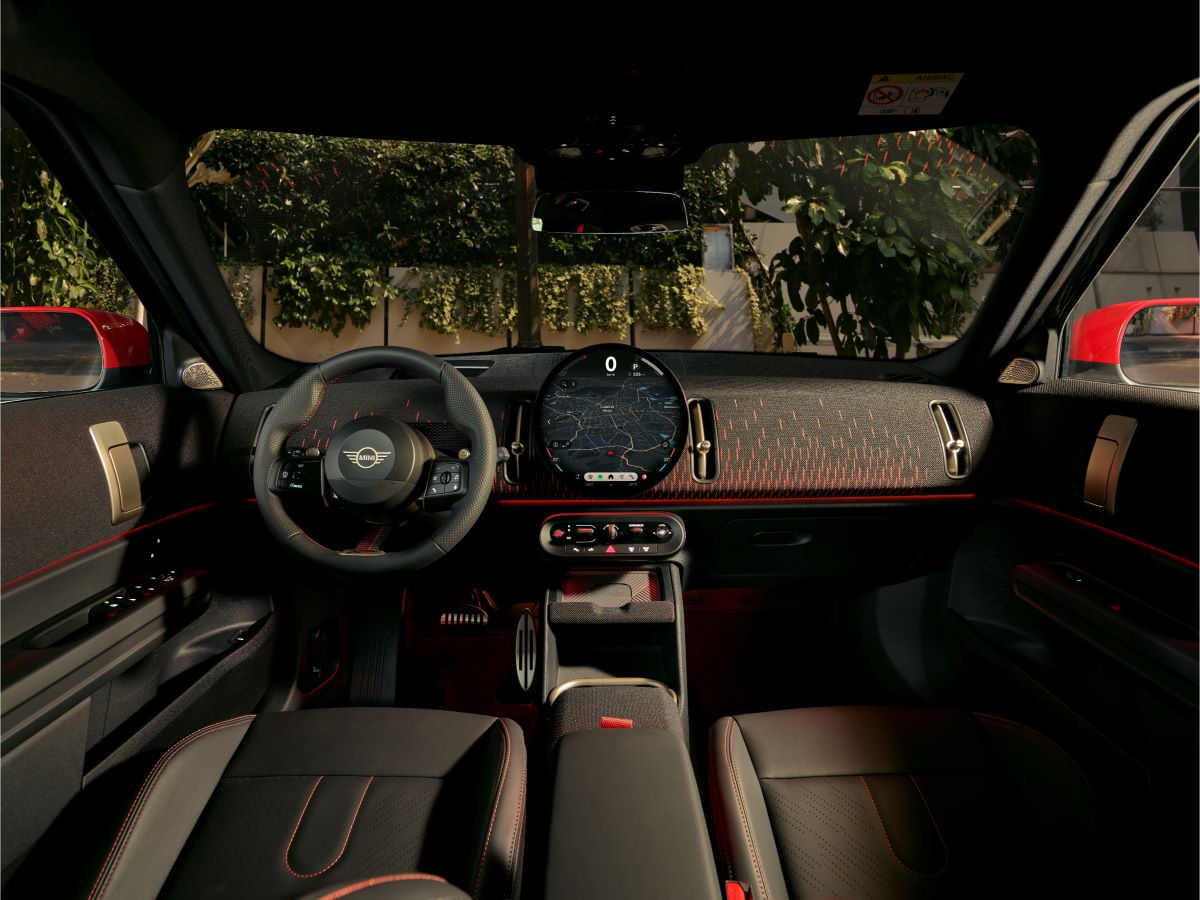 Η καμπίνα του νέου Countryman είναι ένας συνδυασμός μινιμαλισμού και υψηλής τεχνολογίας. Το βλέμμα τραβάει αμέσως η κεντρική κυκλική οθόνη OLED υψηλής ανάλυσης, η οποία τρέχει το Mini Operating System 9. Είναι η πρώτη φορά που ένα αυτοκίνητο χρησιμοποιεί μια τόσο προηγμένη στρογγυλή οθόνη, αποτίοντας φόρο τιμής στο αυθεντικό ταχύμετρο του κλασικού Mini. Τα υλικά είναι κορυφαίας ποιότητας, με εκτεταμένη χρήση ανακυκλωμένων υφασμάτων στο ταμπλό που φωτίζονται από τον ατμοσφαιρικό φωτισμό, δημιουργώντας μια μοναδική αύρα το βράδυ. Τα σπορ καθίσματα JCW προσφέρουν εξαιρετική πλευρική στήριξη, απαραίτητη για τις γρήγορες στροφές, ενώ οι χώροι είναι πλέον επαρκείς για μια πενταμελή οικογένεια, με το πορτμπαγκάζ να αγγίζει τα 460 λίτρα (και να επεκτείνεται στα 1.450 με τα καθίσματα αναδιπλωμένα).